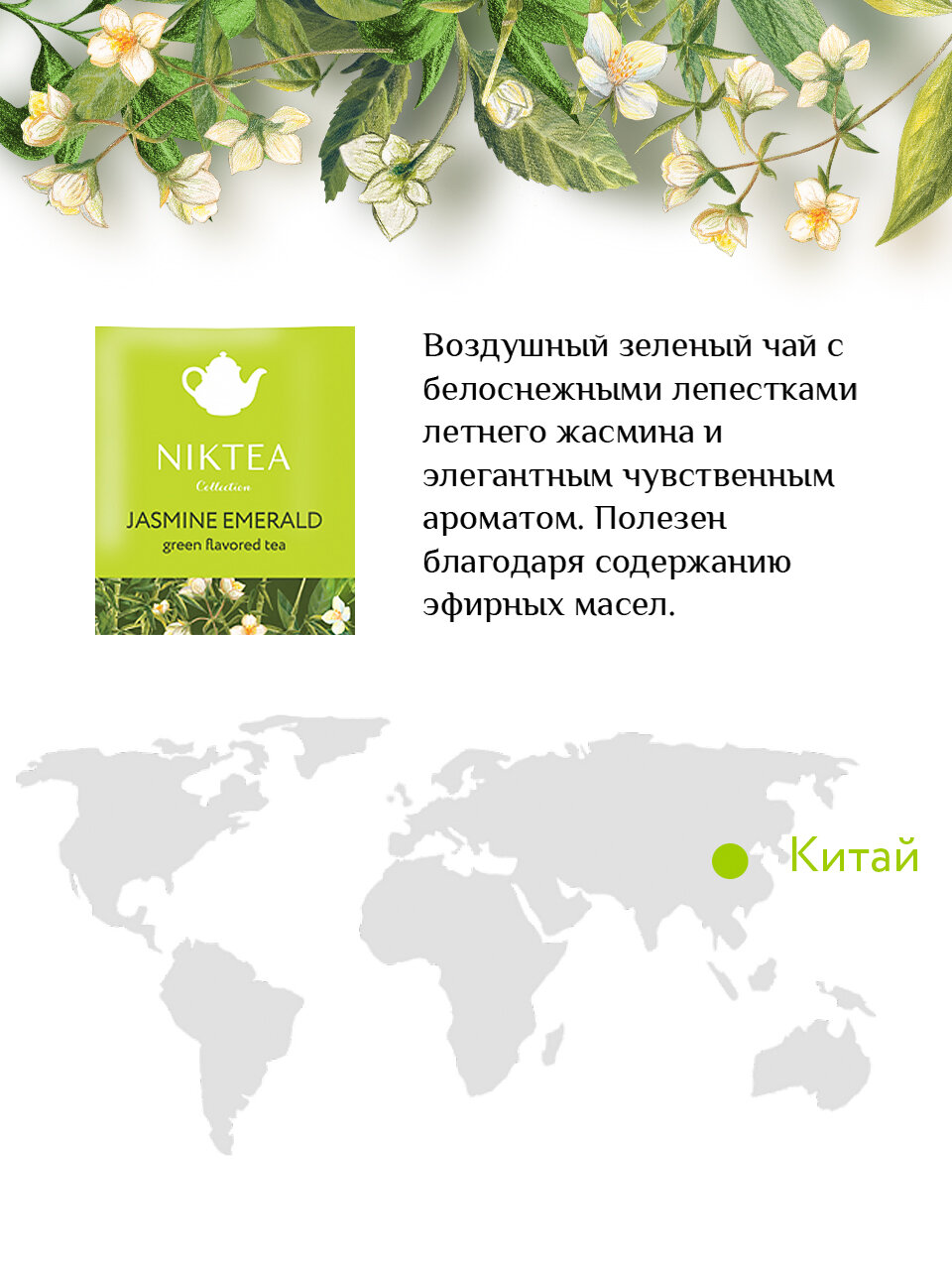 Воздушный зелёный чай с белоснежными лепестками летнего жасмина и элегантным чувственным ароматом. Полезен благодаря содержанию эфирных масел.