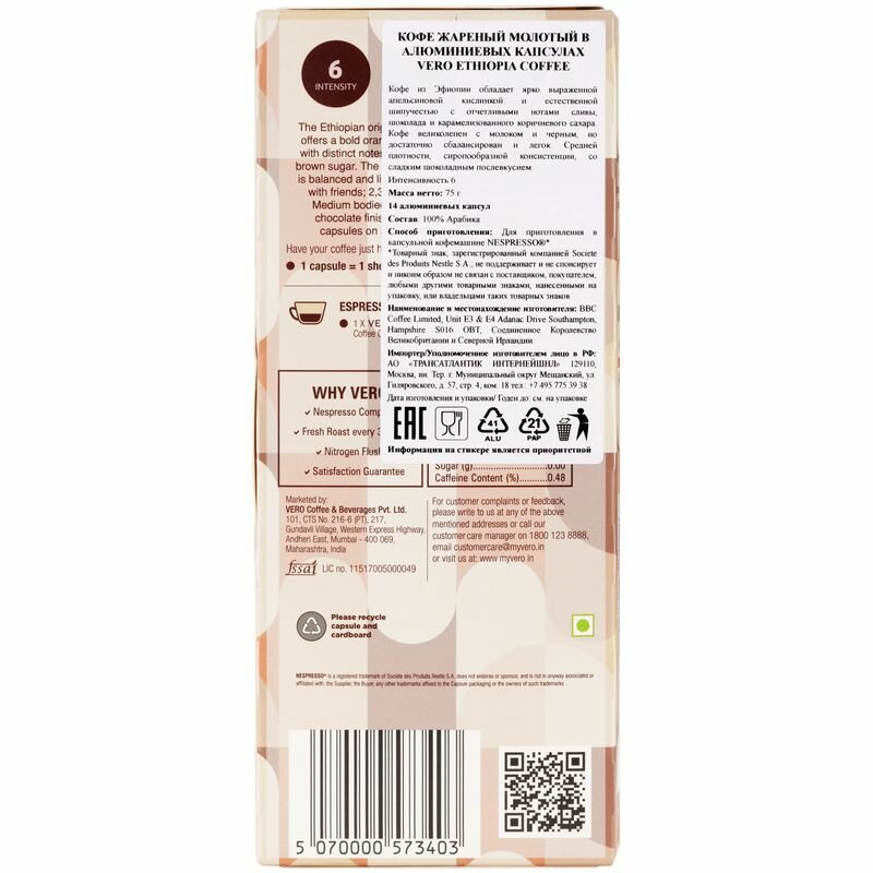 Кофе в капсулах VERO Ethiopia cofee 14шт BBC Coffee Limited
