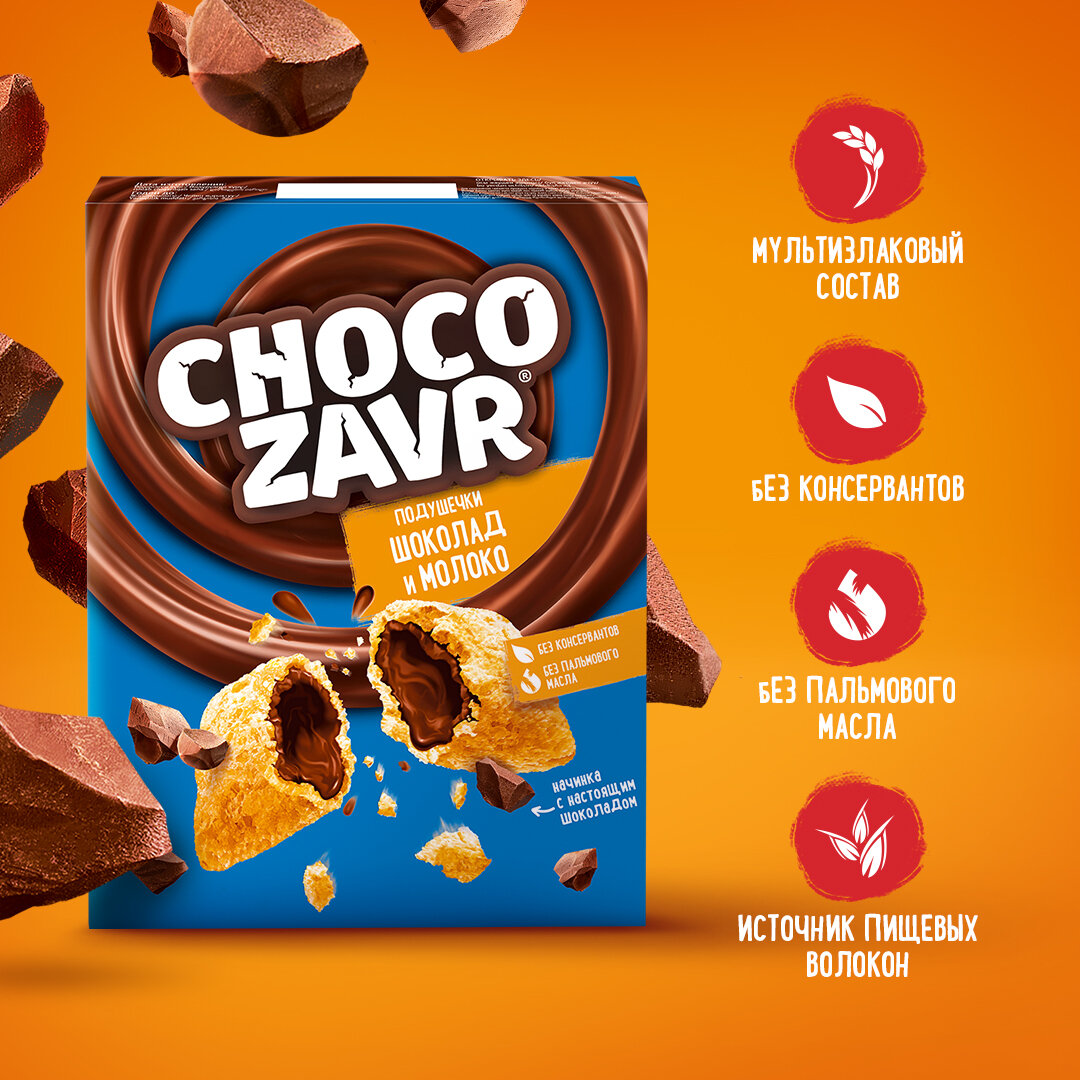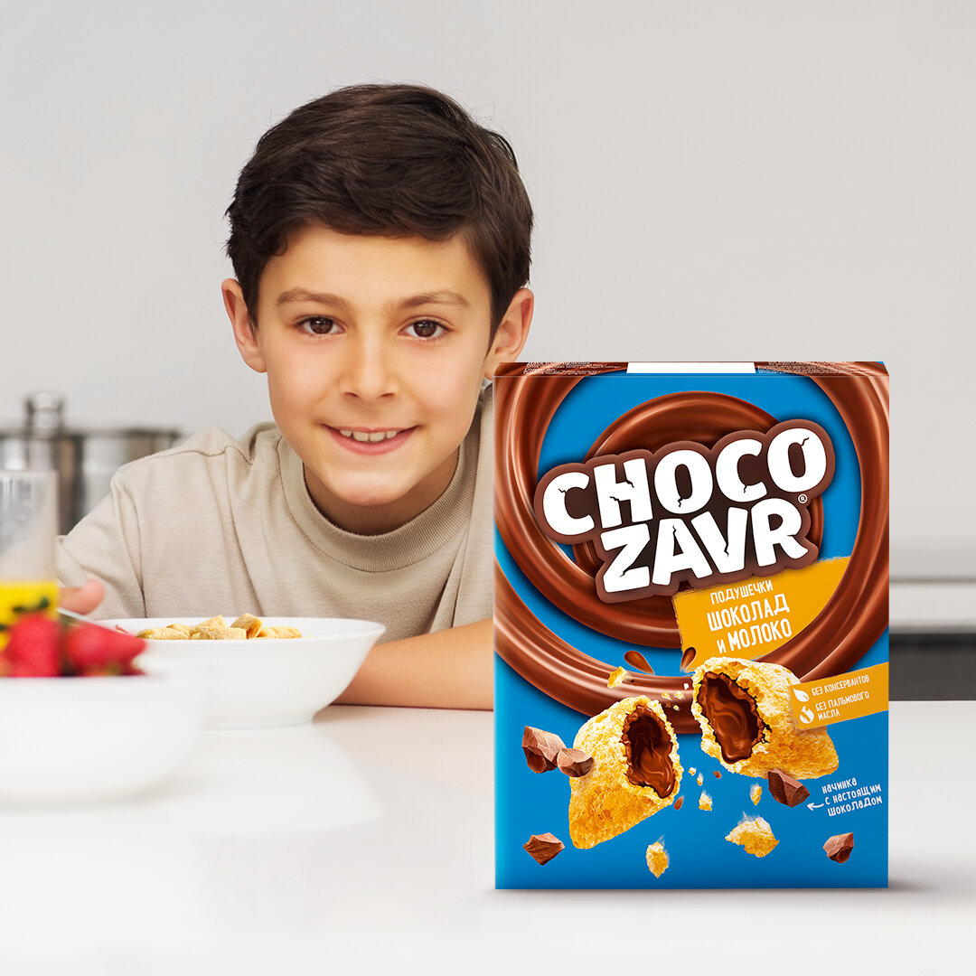 Хрустящие подушечки с нежной шоколадно-молочной начинкой. Мультизлаковый состав без консервантов и пальмового масла делает этот готовый завтрак невероятно питательным, а тающая начинка – потрясающе вкусным!