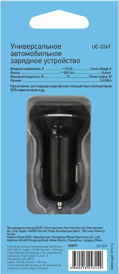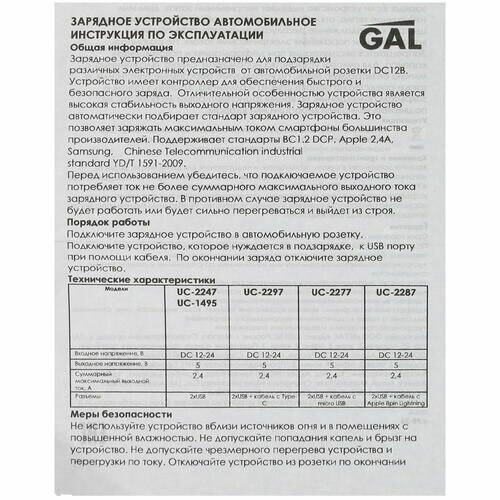 Зарядное устройство автомобильное GAL UC-2247 2 USB 2.4А Changzhou Wistar Electronics Co.,Ltd
