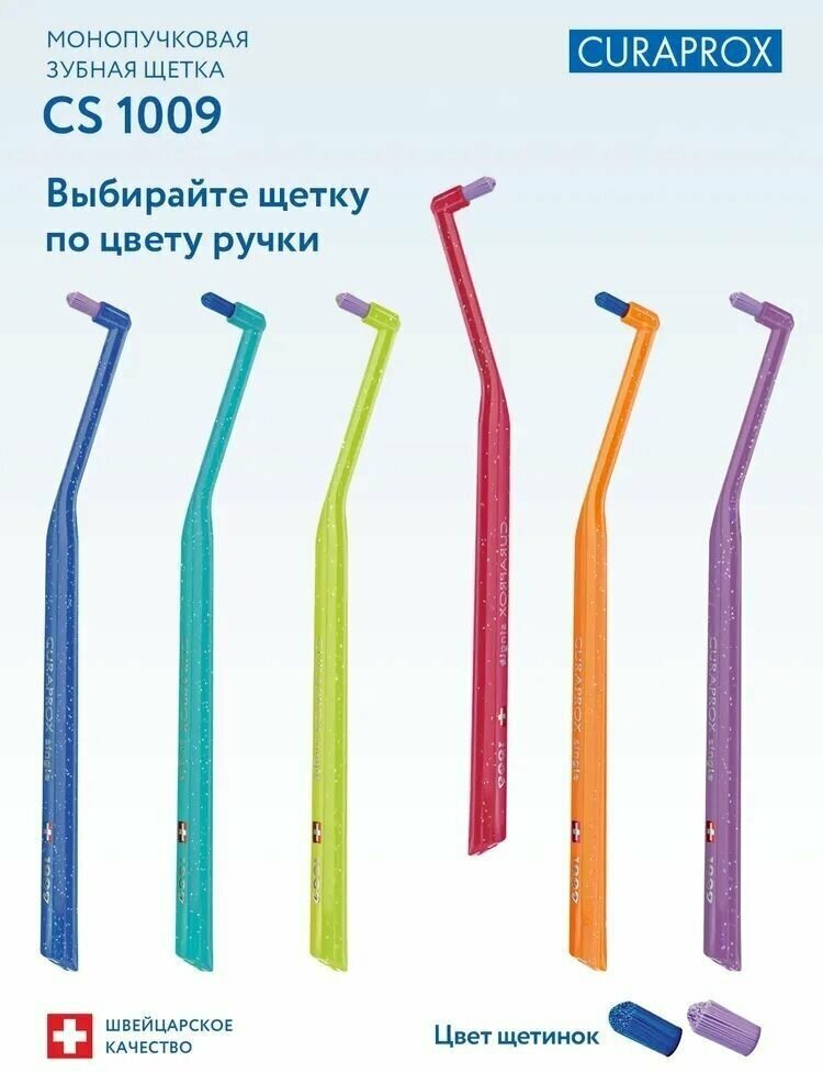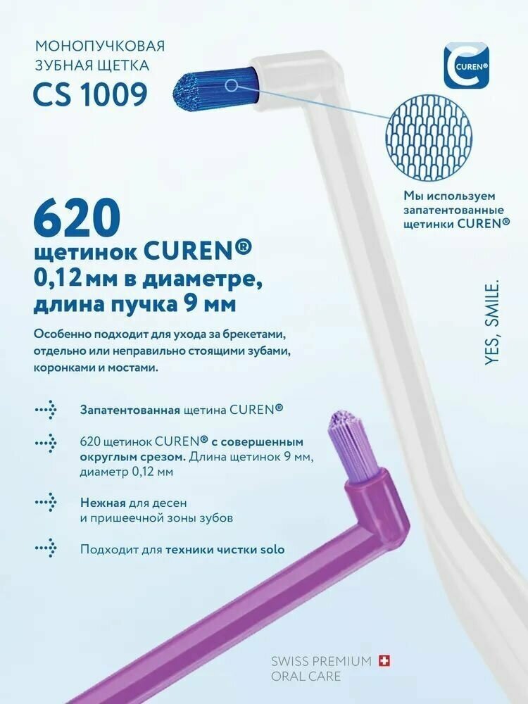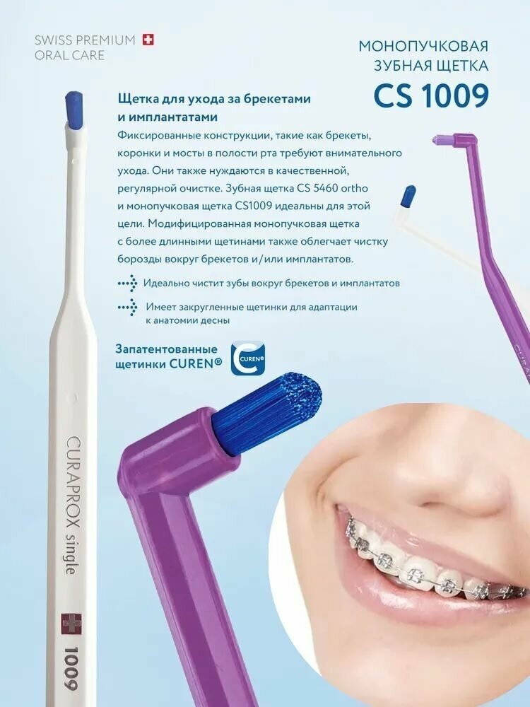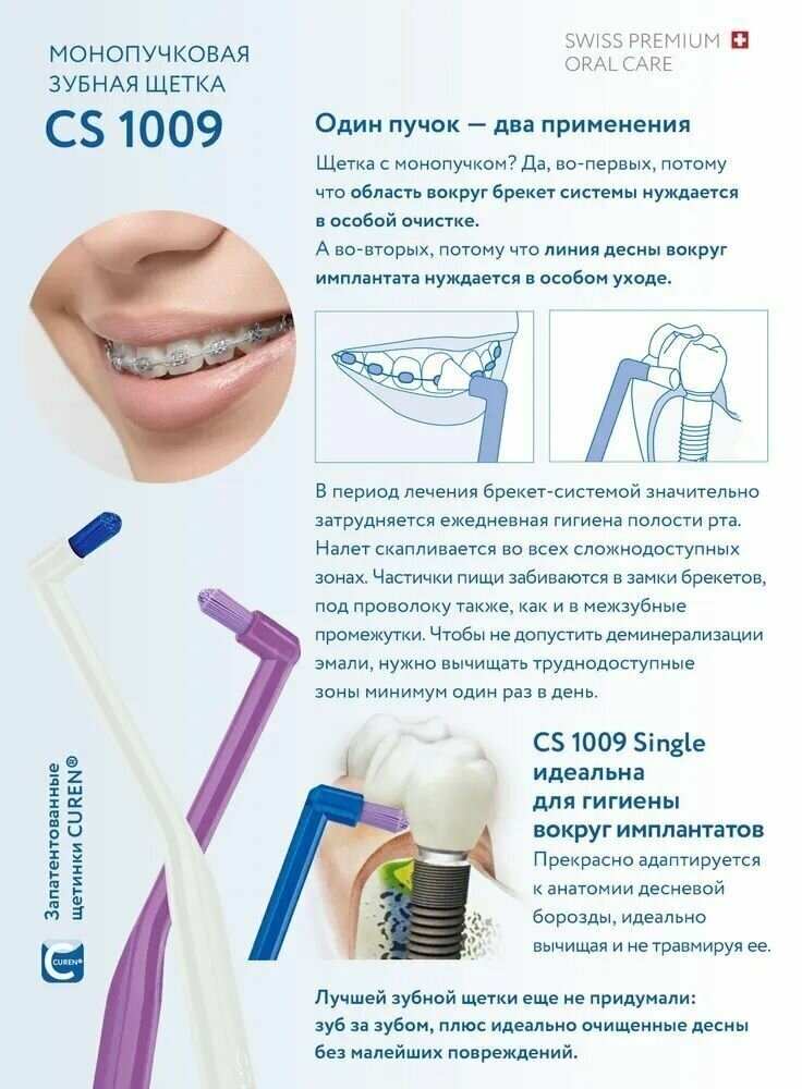 CS "Single & sulcular" — совершенная зубная щетка с ультратонкими щетинками Curen (9 мм) разработана специально для техники чистки solo - удаления налёта с каждого зуба по отдельности и специально для ухода за брекетами, отдельно или неправильно стоящими зубами, коронками и мостами.Зубная щетка CURAPROX CS 1009 Single & Sulcular рекомендована для чистки бороздок и удаления налета с каждого зуба по отдельности и позволяет тщательно и атравматично очищать придесневую зону, межзубные промежутки и брекет-системы, то есть без повреждения десен и зубной эмали.Ультратонкие щетинки, длина которых составляет 9 мм, состоят из запатентованных волокон CUREN и тщательно, но бережно удаляют налет, не повреждая десна и не создавая микротрещины на эмали зубов.Запатентованные щетинки CUREN фирмы CURAPROX изготовлены из ультратонких волокон полиэстера последнего поколения, что позволяет щетке сохранять упругость на протяжении многих месяцев. Круглая форма кисточки и нежные щетинки обеспечивают превосходную адаптацию к анатомии десневого края, не оказывая никакого давления!В комплекте с щеткой идет защитный чехол для удобной перевозки — можно путешествовать, не расставаясь с любимой щеткой.Цвет щетины может отличаться от указанной на фото.