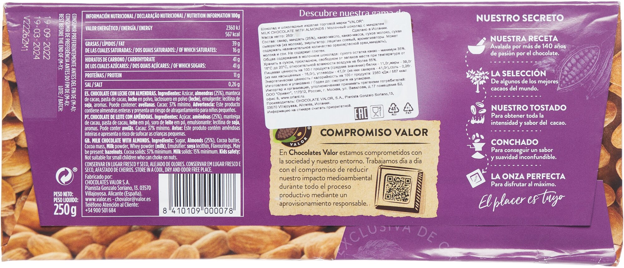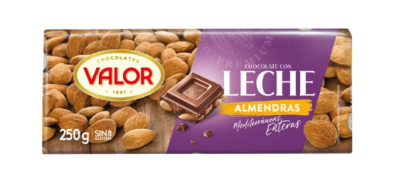 Семейная шоколадная фабрика уже более 140 лет производит продукцию под брендом VALOR, который на сегодня является самым продаваемым брендом шоколадных конфет в Испании. Использование лучших какао-бобов мира и строгий контроль на всех этапах уникального производственного процесса – залог получения шоколада премиум качества с интенсивным вкусом и ароматом и исключительной текстурой. Valor Молочный шоколад с миндалем, 250г. Состав: сахар, миндаль (25%), какао-масло, какао-масса, сухое молоко, сухая сыворотка (из молока), эмульгатор: лецитин соевый, ароматизаторы. Может содержать незначительное количество орехов (лесной орех, миндаль), молока и сои. Не содержит глютен. Общее содержание в молочном шоколаде: сухого остатка какао - минимум 35%.