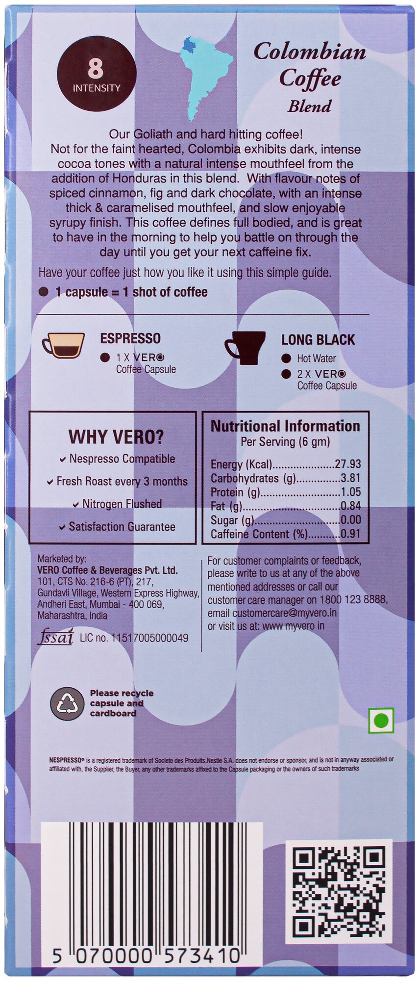 Кофе жареный молотый в алюминиевых капсулах VERO COLOMBIA COFFEE. В кофе из Колумбии проявляются темные, интенсивные черты какао и натуральный насыщенный вкус благодаря добавлению зерен из Гондураса. С нотами пряной корицы, инжира и темного шоколада. С интенсивным, густым и карамелизированным вкусом и медленным приятным сиропообразным послевкусием. Этот кофе обладает полным вкусом, его приятно пить утром, чтобы зарядиться энергией на весь день. Интенсивность 8 Масса нетто:75 г 14 алюминиевых капсул Состав: 100% Арабика Способ приготовления: Для приготовления в капсульной кофемашине NESPRESSO. Хранить в сухом прохладном месте.