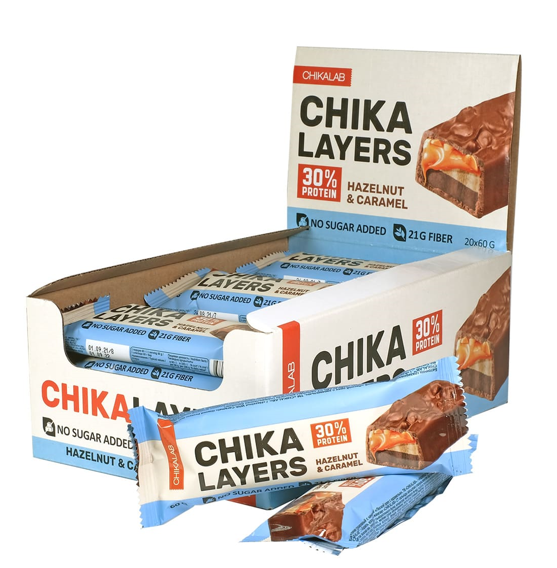 Пятислойные батончики от Chikalab CHIKA LAYERS - Это ароматный слой из густой карамели и орехов в сочетании со слоями протеина и пралине, батончик покрыт нежным молочным шоколадом без сахара. CHIKA LAYERS это полезный и невероятный батончик, в составе которого нет сахара, 18 грамм белка на одну порцию, 21 грамм дополнительной клетчатки. Это обеспечивает добор белка в вашем рационе, клетчатка несёт пользу для пищеварения, используются только натуральные ингредиенты высочайшего качества. Небольшая калорийность на насыщенный протеиновый батончик и потрясный вкус! Состав: белковая смесь (концентрат сывороточного белка, концентрат молочного белка), водорастворимые волокна кукурузы, молочный шоколад (водорастворимые волокна кукурузы, масло какао, какао тёртое, молоко сухое обезжиренное, эмульгатор (соевый лецитин), ароматизаторы натуральные, подсластитель (сукралоза)), инулин (пищевые волокна), олигофруктоза (пищевые волокна), фундук, какао-порошок, масло кокосовое, вода, агенты влагоудерживающие (глицерин, сорбит), соль морская, ароматизаторы натуральные, регулятор кислотности (лимонная кислота), эмульгатор (соевый лецитин), антиокислитель (аскорбиновая кислота), консервант (сорбат калия), подсластитель (стевия).Может содержать незначительное количество кешью, арахиса.