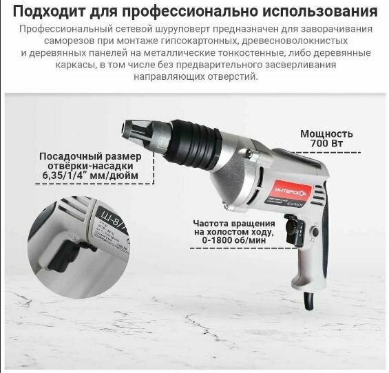 Интерскол Ш-8/700 ЭР - сетевой шуруповерт для профессионального применения при выполнении отделочных работ помещений листовыми материалами. Компактный эргономичный корпус, прорезиненная рукоятка и специальная скоба для ношения на ремне обеспечивают максимальный комфорт во время работы.