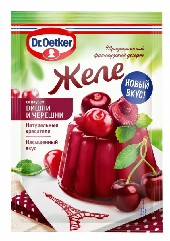 Желе со вкусом вишни и черешни DR OETKER – это яркий дуэт фруктовых вкусов и насыщенный цвет. Легко готовится, не требует добавления сахара. Желе быстро застывает и отлично держит форму, подходит для создания многослойных десертов необычной формы. Содержит только натуральные красители. Комплект 5 уп.