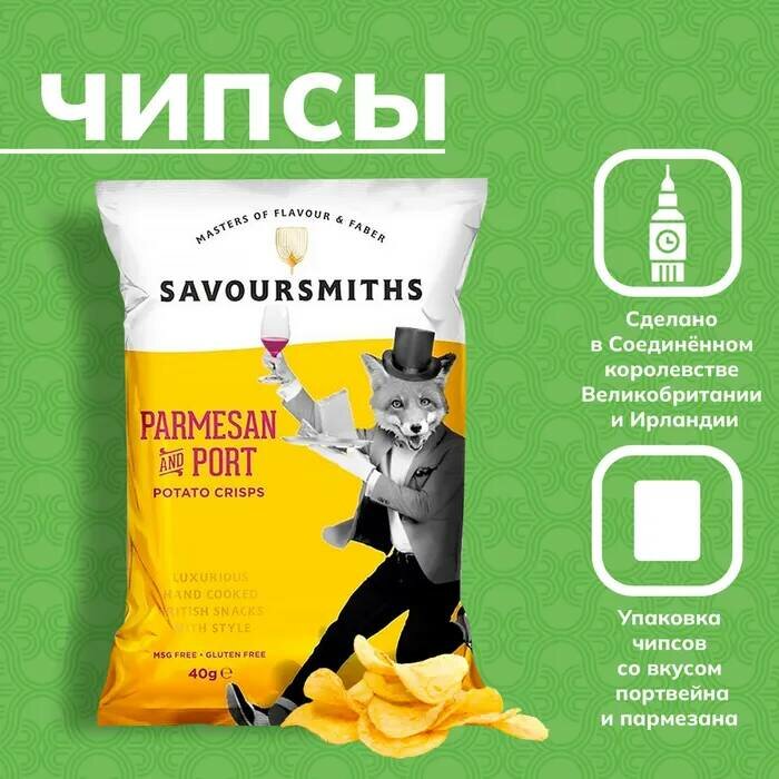 SAVOURSMITHS - супер-премиальный бренд натуральных картофельных чипсов из Англии. Мы выпускаем хрустящие и нежные картофельные чипсы cуникальными яркими вкусами. Наш продукт - это нечто особенное для ценителей качественных снеков – роскошные картофельные чипсы Savoursmiths. Они сделаны вручную из лучших сортов картофеля, выращенного на нашей семейной ферме в Кембриджшире на востоке Англии. Наш подход - от фермы напрямую к потребителю! Мы создаем продукты с исключительно приятным вкусом и оставляем кожицу на картофеле для сохранения важных питательных веществ и питательной ценности продукта. Чипсы SAVOURSMITHS нарезается из британского картофеля, собранного вручную, и готовятся вручную небольшими партиями. Мы уделяем пристальное внимание методам выращивания картофеля и отбираем только высококачественные ингредиенты, в результате получается более здоровый продукт превосходного качества. Весь ассортимент наших чипсов состоит только из натуральных ингредиентов и натуральных ароматизаторов и не содержит глютена и глутамата натрия. Ассортимент наших чипсов включает в себя семь уникальных вкусов, в составе каждого их них - лучшие ингредиенты со всего мира. Яркая, премиальная упаковка с изображением уникальных персонажей привлекает внимание к продукту с первого взгляда, выгодно выделяет наши чипсы среди конкурентов. Уникальные свойства наших чипсов: - Уникальные вкусы и ингредиенты выгодно отличают нас от конкурентов - Только натуральные ингредиенты - Картофель, выращенный на семейной ферме - Наш подход - от фермы напрямую к потребителю - Яркая, премиальная упаковка, пригодная для вторичной переработки - Подходит для вегетарианцев - Без глютена - Не содержит глутамат натрия В ассортименте SAVOURSMIT В ассортименте SAVOURSMITHS представлены 7 восхитительных вкусов со всего мира, которые пощекочут вкусовые рецепторы, расширят вкусовые горизонты, подарят уникальные вкусовые ощущения. С итальянским сыром и Порто Руби Мягкая, нежная сладость портвейна пронизывает сочный итальянский сыр.