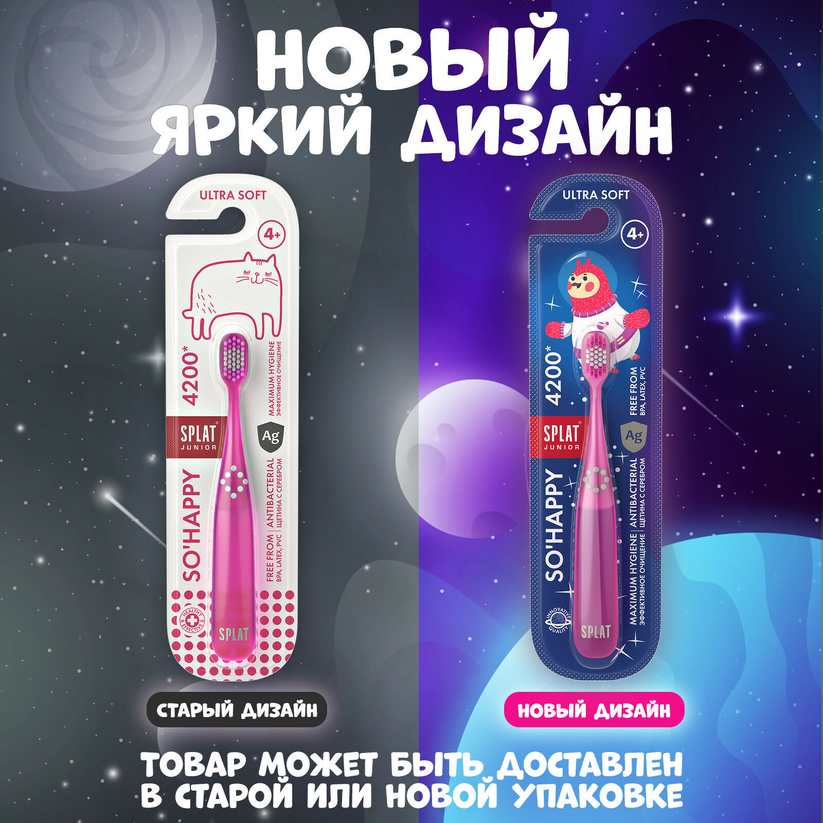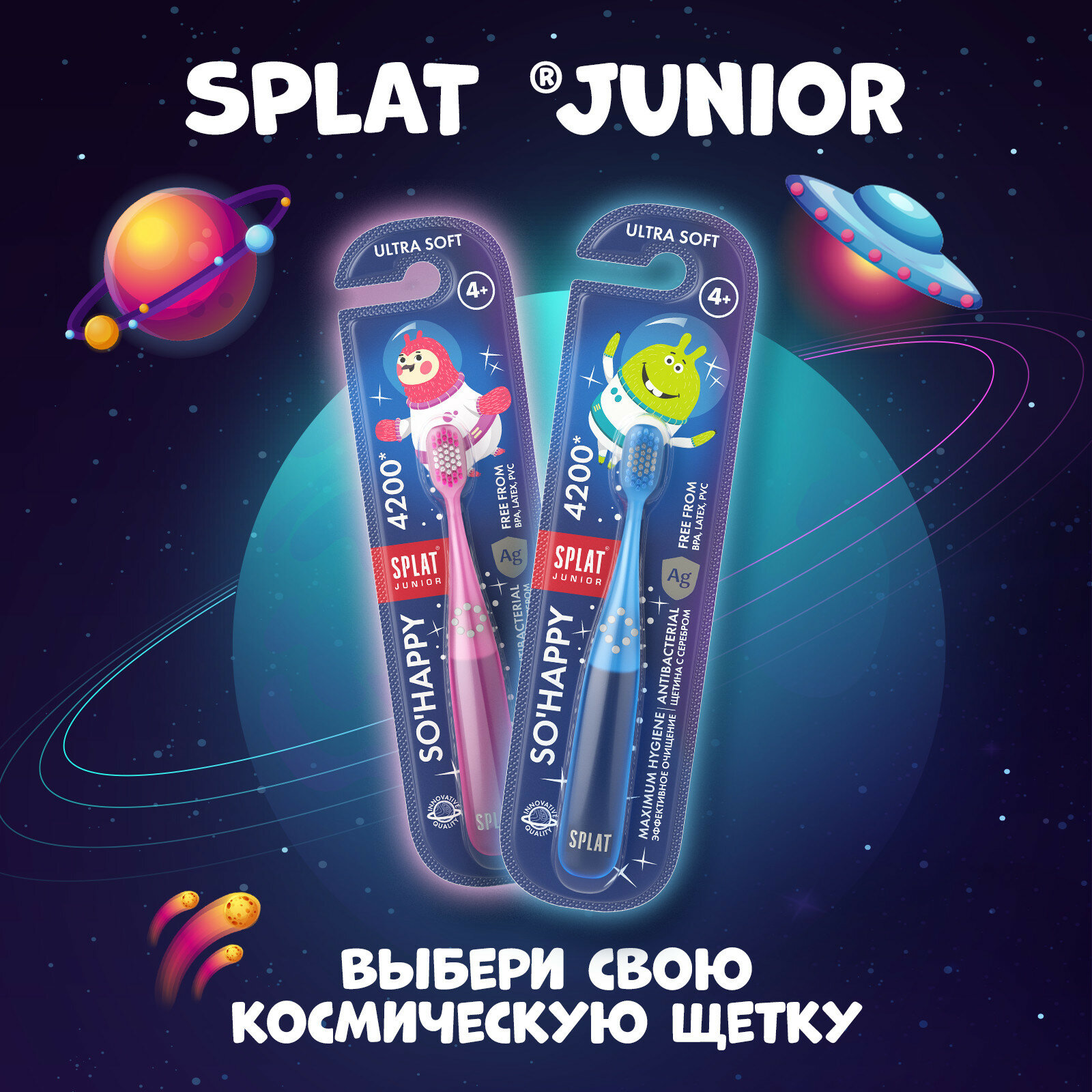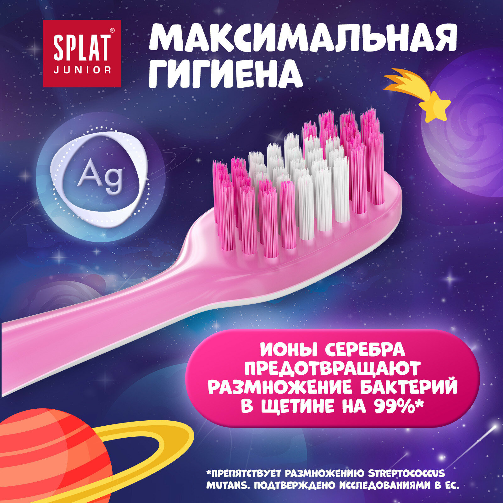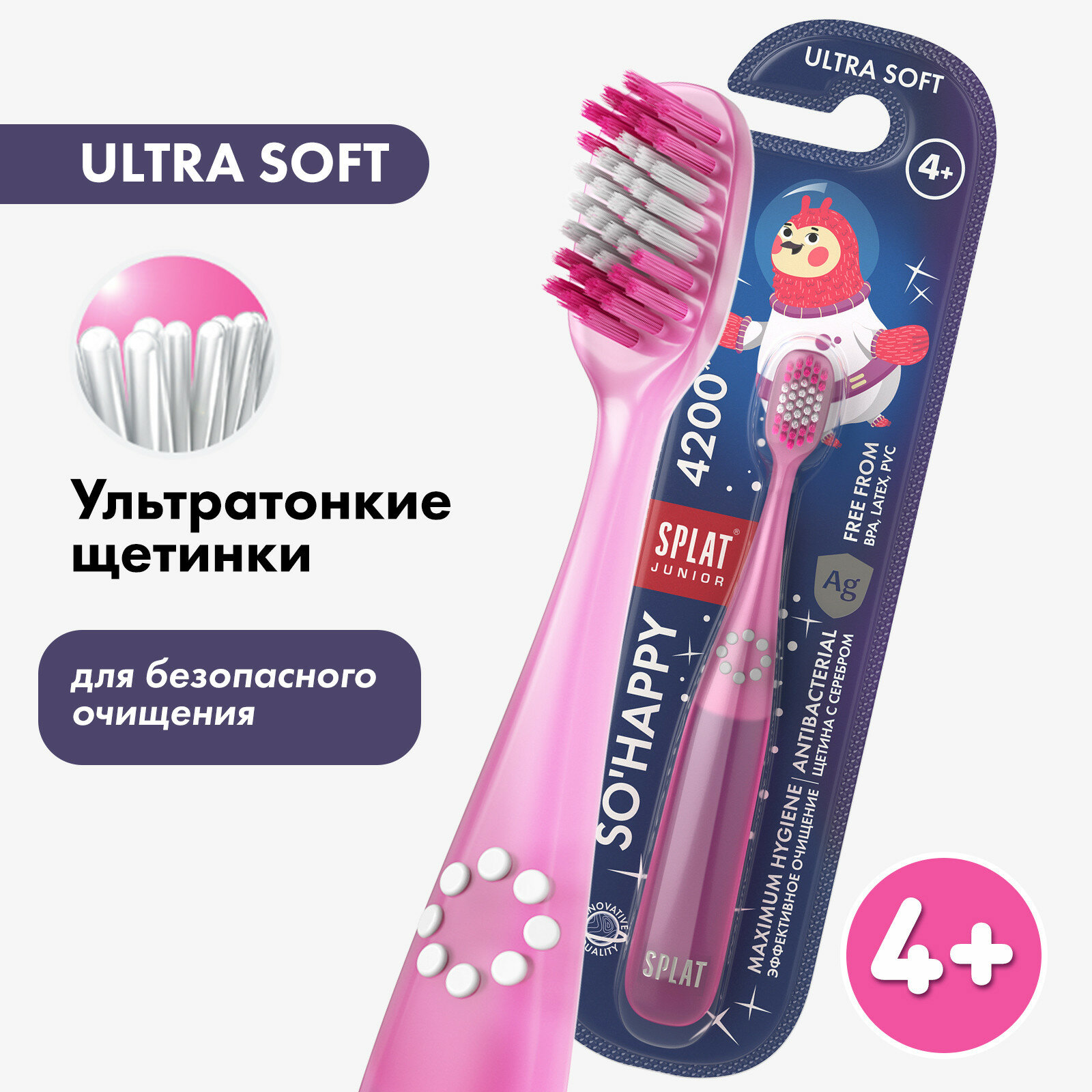 Инновационная ультрамягкая зубная щетка для детей от 4 лет SPLAT Junior ULTRA 4200 1. антибактериальная щетина И максимальная гигиена • Ионы серебра предотвращают размножение бактерий в щетине на 99%* • Щетина не касается поверхности, когда зубная щетка лежит на боку 2. 4200 ультратонких щетинок для лучшего очищения • 4200** щетинок эффективно и мягко очищают участки зубов, где наиболее часто образуется кариес • Инновационное сапфировое округление кончиков ультратонких щетинок (0,102 мм) бережно очищает зубы и массирует десны • Выделено цветовое поле для дозирования зубной пасты 3. абсолютно безопасные материалы • Не содержит: бисфенол А, латекс, ПВХ • Ручка из высококачественного пластика, абсолютно безопасного для детей (соответствует требованиям GREENGUARD) Зубные щётки представлены в двух цветах. Используйте щетку с детскими зубными пастами SPLAT Junior * Препятствует размножению Streptococcus mutants в щетине. Подтверждено исследованиями в ЕС ** Среднее количество щетинок.