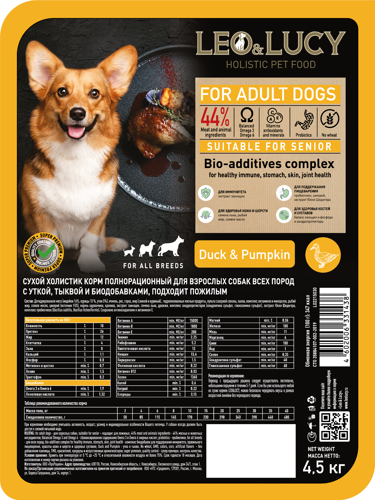 Сухой корм для собак Leo&Lucy с уткой тыквой и биодобавками подходит пожилым 1.6кг Прорацион