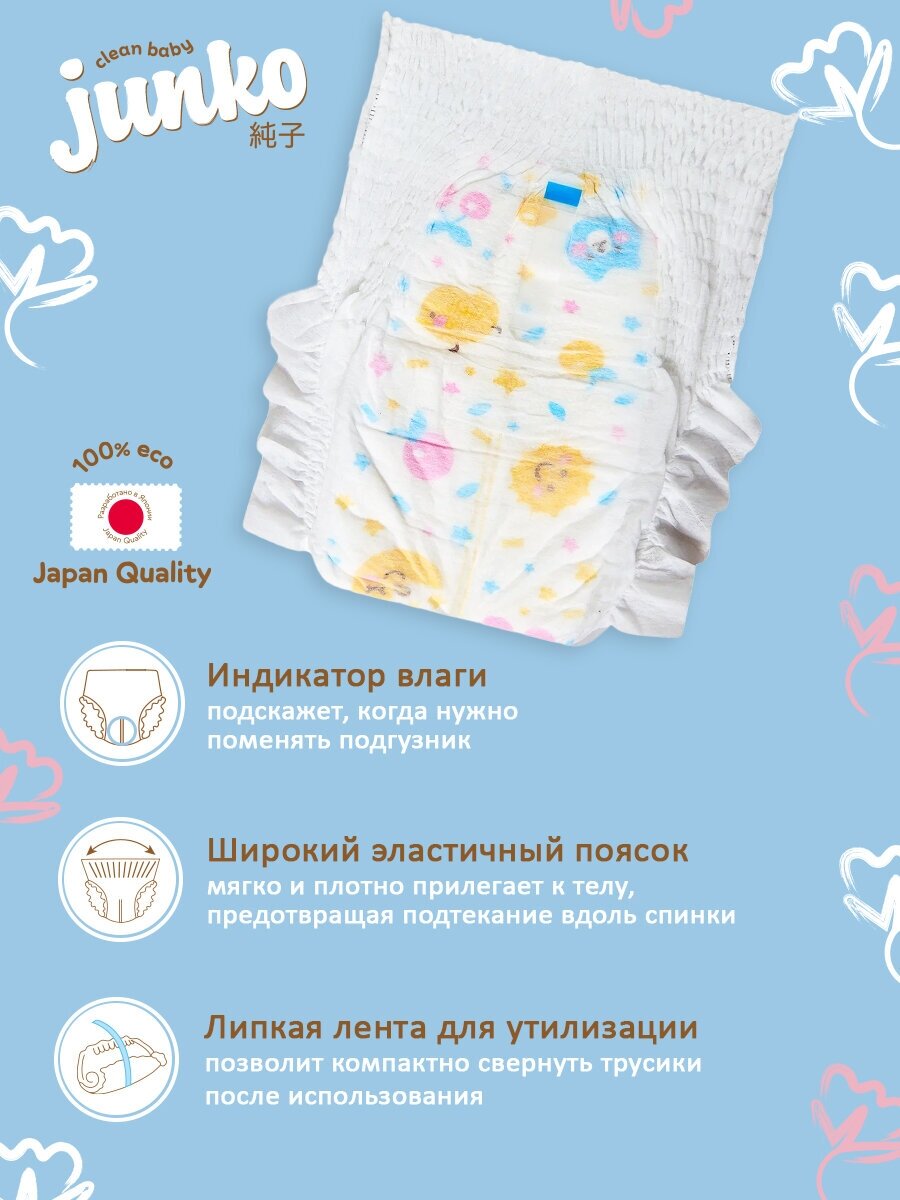 Трусики-подгузники для малышей Junko - это новинка, сочетающая в себе уникальное японское качество и максимальный комфорт. Разработана с учетом требований современных мам, рекомендовано дерматологами. При изготовлении подгузников-трусиков используется японский суперабсорбент, который способен за несколько секунд впитывать влагу и надежно удерживать ее до 12 часов. Ультратонкий и дышащий слой трусиков обеспечивает мгновенное распределение жидкости, без образования комков. Благодаря широкому эластичному пояску подгузники трусики мягко и плотно прилегают к телу вашего малыша, предотвращая подтекание вдоль спинки. Нежный и мягкий 3D слой защищает кожу малыша от раздражений и опрелостей, позволяя ей оставаться чистой и сухой и днем и ночью. Подгузники-трусики оснащены индикатором влаги, который поможет определить, когда необходимо поменять трусики. Объемные внутренние оборочки подгузников-трусиков защищают от протекания вокруг ножек. Легко надевать - просто натяните трусики. Для того, чтобы снять трусики - разорвите швы на пояске. Лента для утилизации позволит компактно свернуть трусики после использования. Даже у самых активных малышей подгузники-трусики не сползают, не мешают активному движению. Идеально подходят и для мальчиков и для девочек. Закажите подгузники-трусики Junko и подарите малышу нежность и свободное движение.