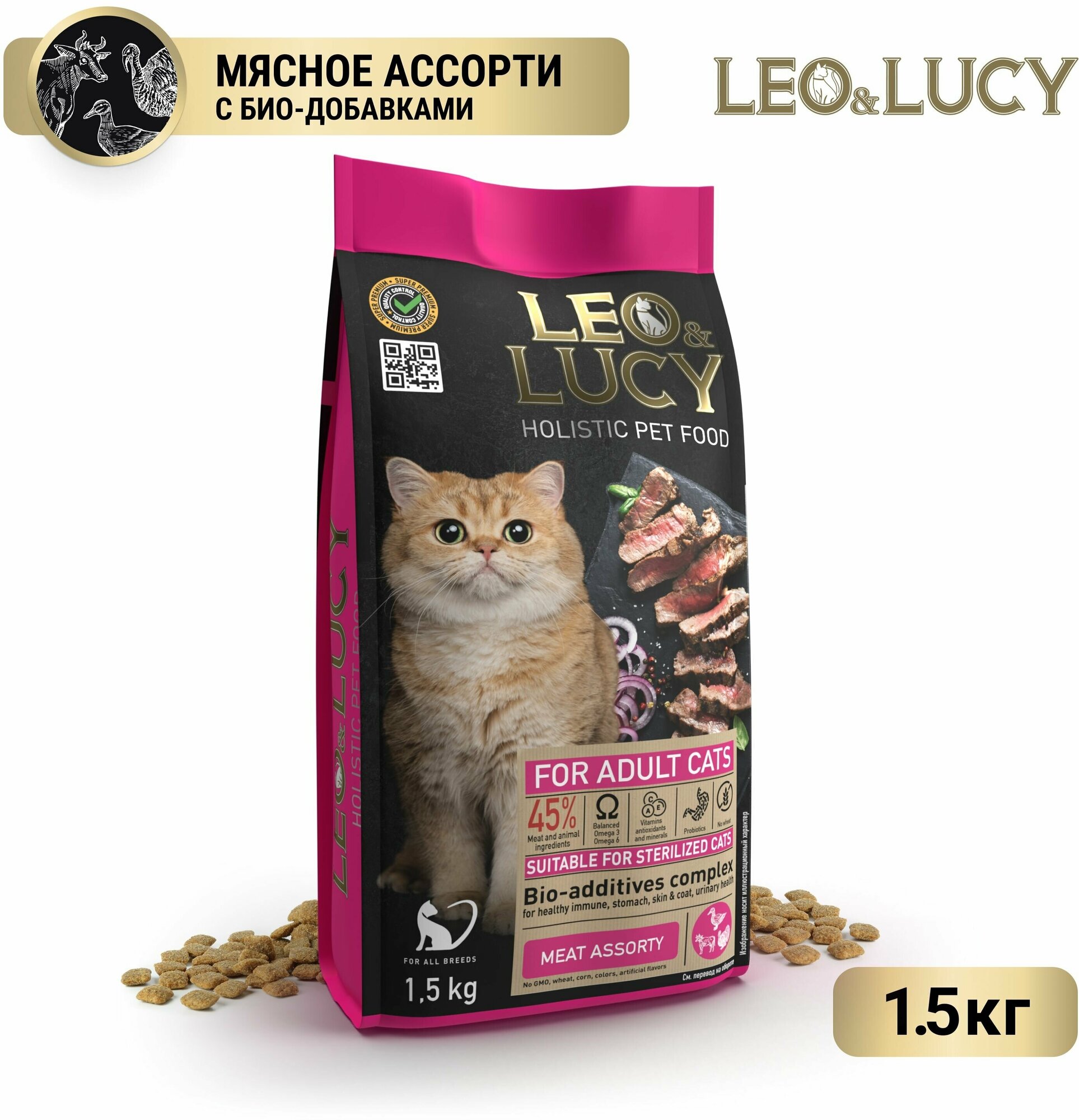 Сухой корм для кошек Leo&Lucy мясное ассорти и биодобавками подходит для стерилизованных 400г Прорацион