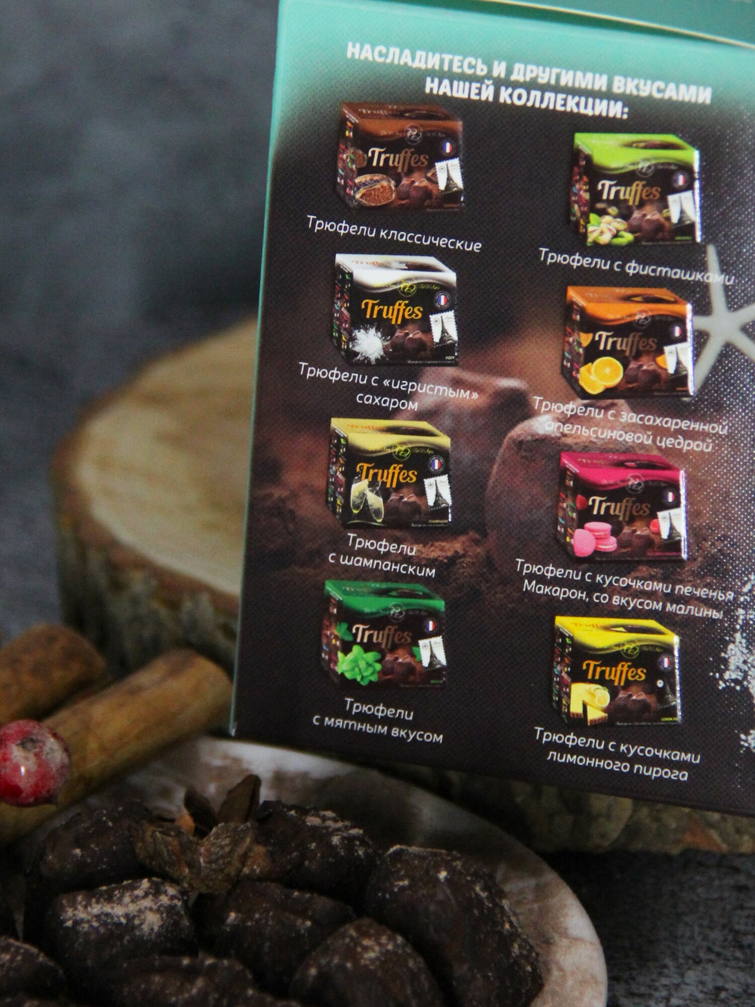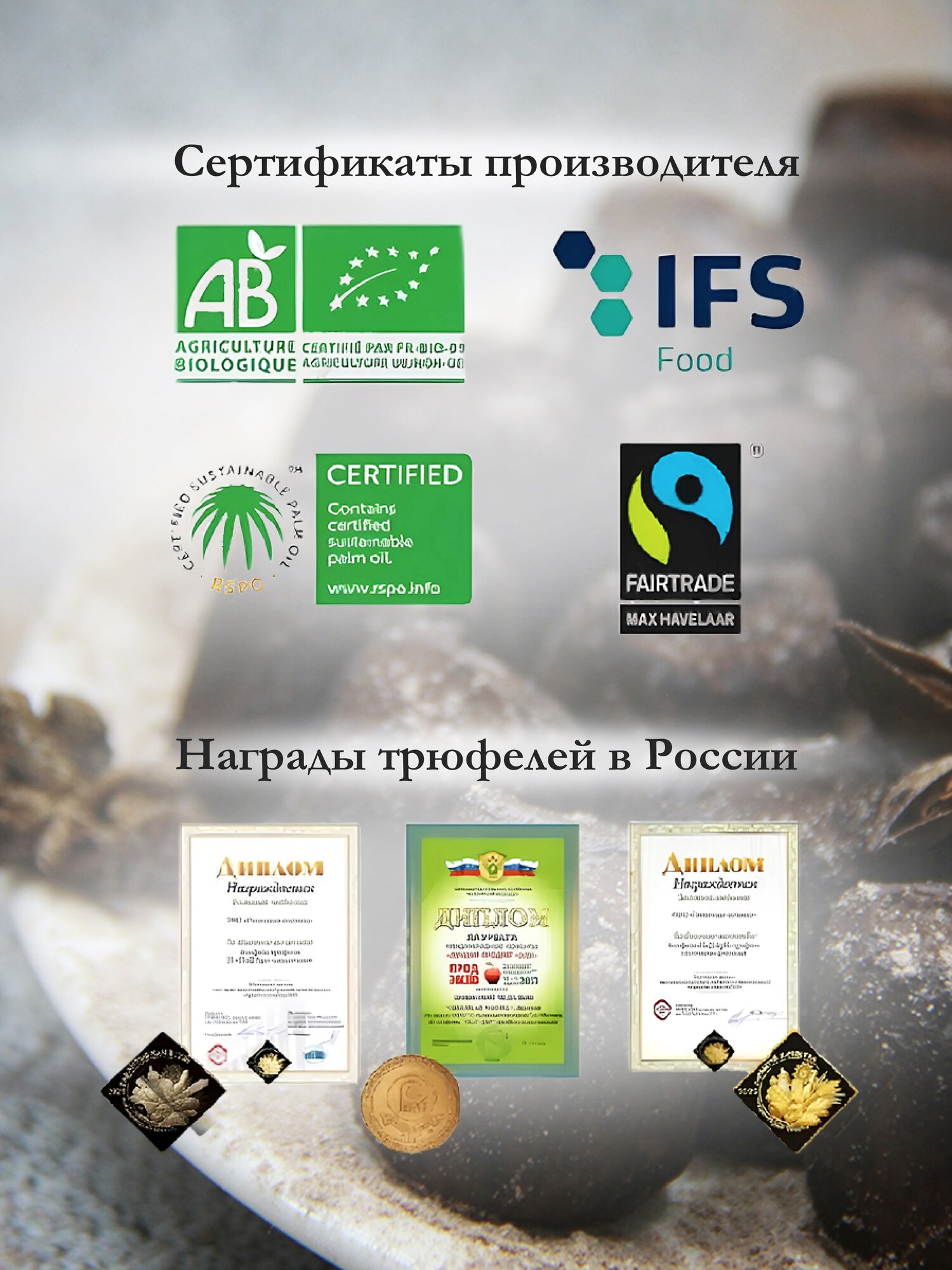 Окунитесь в мир шоколадного трюфеля! Насладитесь интенсивным ароматом какао, его тончайшими оттенками, позвольте радовать вас исключительными ощущениями.Упаковка с оригинальной отделкой выгодно подчеркивает все достоинства вкуса первоклассного десерта.