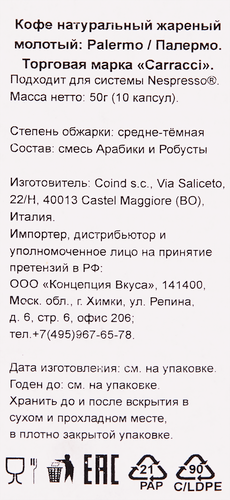 На сегодняшний день товар «Кофе в капсулах Carracci Palermo 10шт Coind Societa Cooperativa» можно купить с кешбеком в 1 магазине: Яндекс.Маркет
