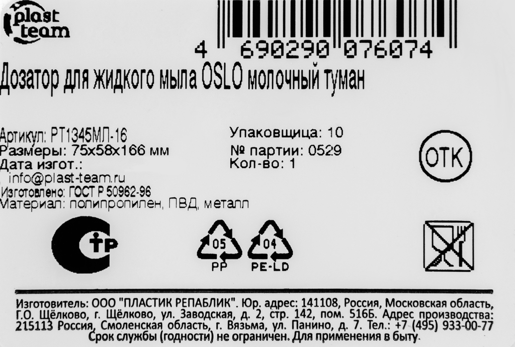 Дозатор для жидкого мыла Plast Team Oslo Пластик репаблик