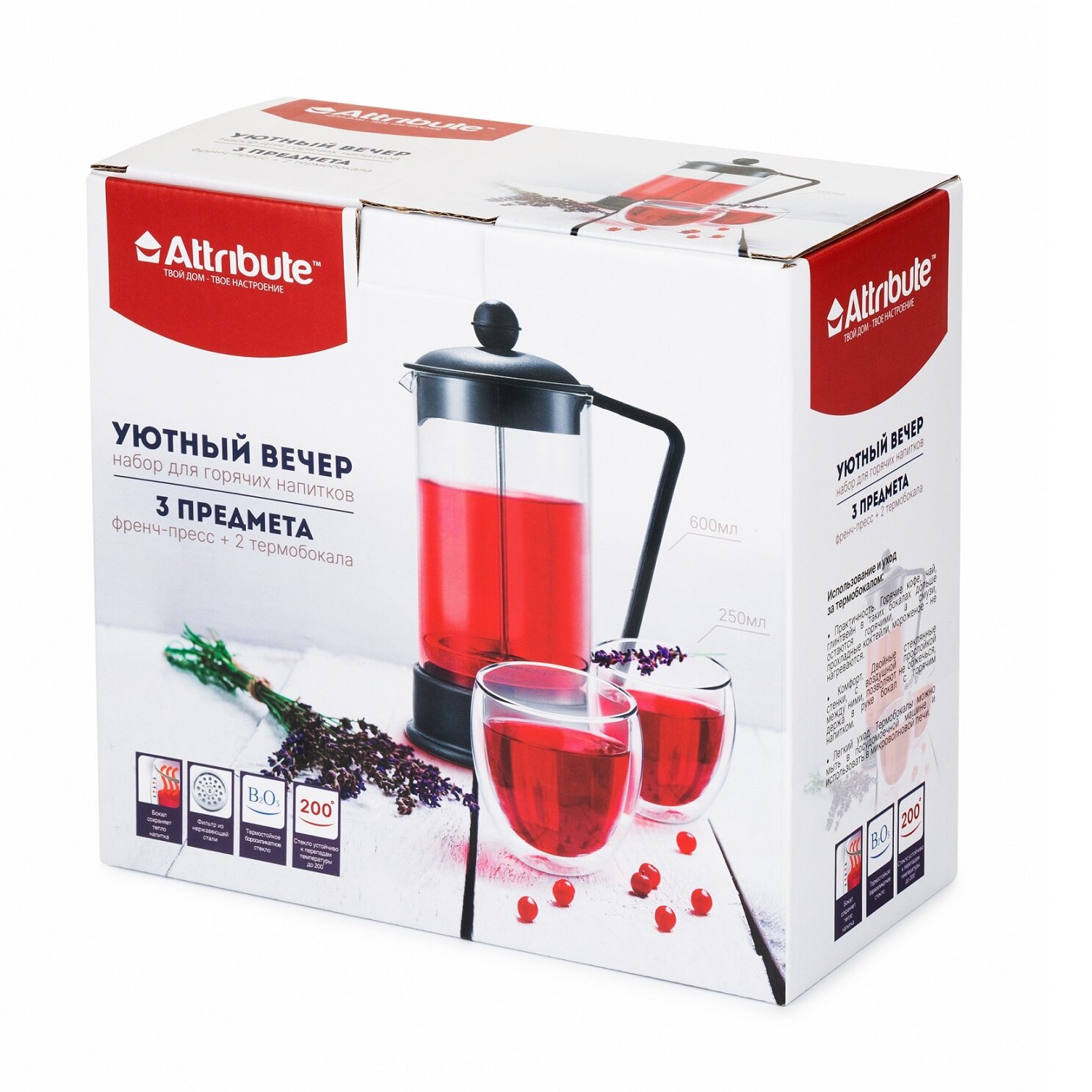 Набор для горячих напитков Attribute tea Уютный вечер Френч-пресс + Термобокал 2шт Guangzhou Oct Glassware