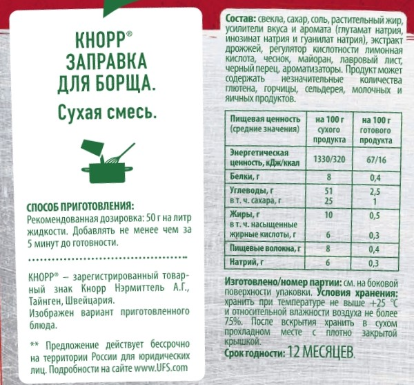 | Состав | свекла, сахар, соль, растительный жир, усилители вкуса и аромата (глутамат натрия, инозинат натрия и гуанилат натрия), экстракт дрожжей, регулятор кислотности лимонная кислота, чеснок, майоран, лавровый лист, черный перец, ароматизаторы |
