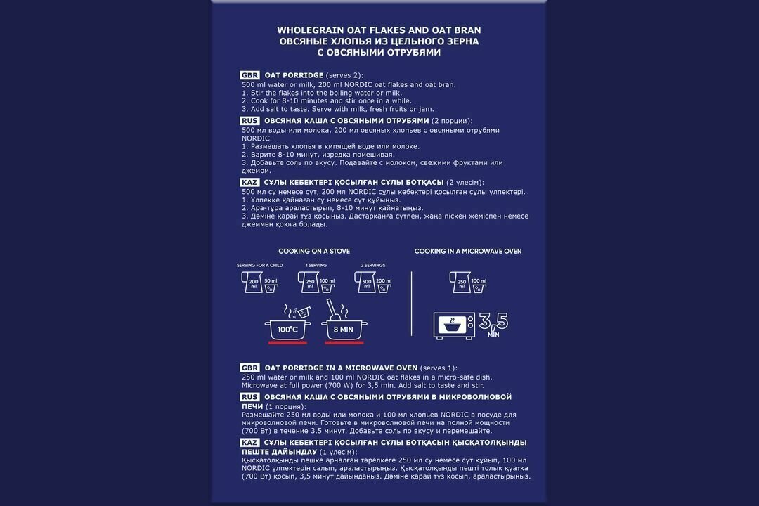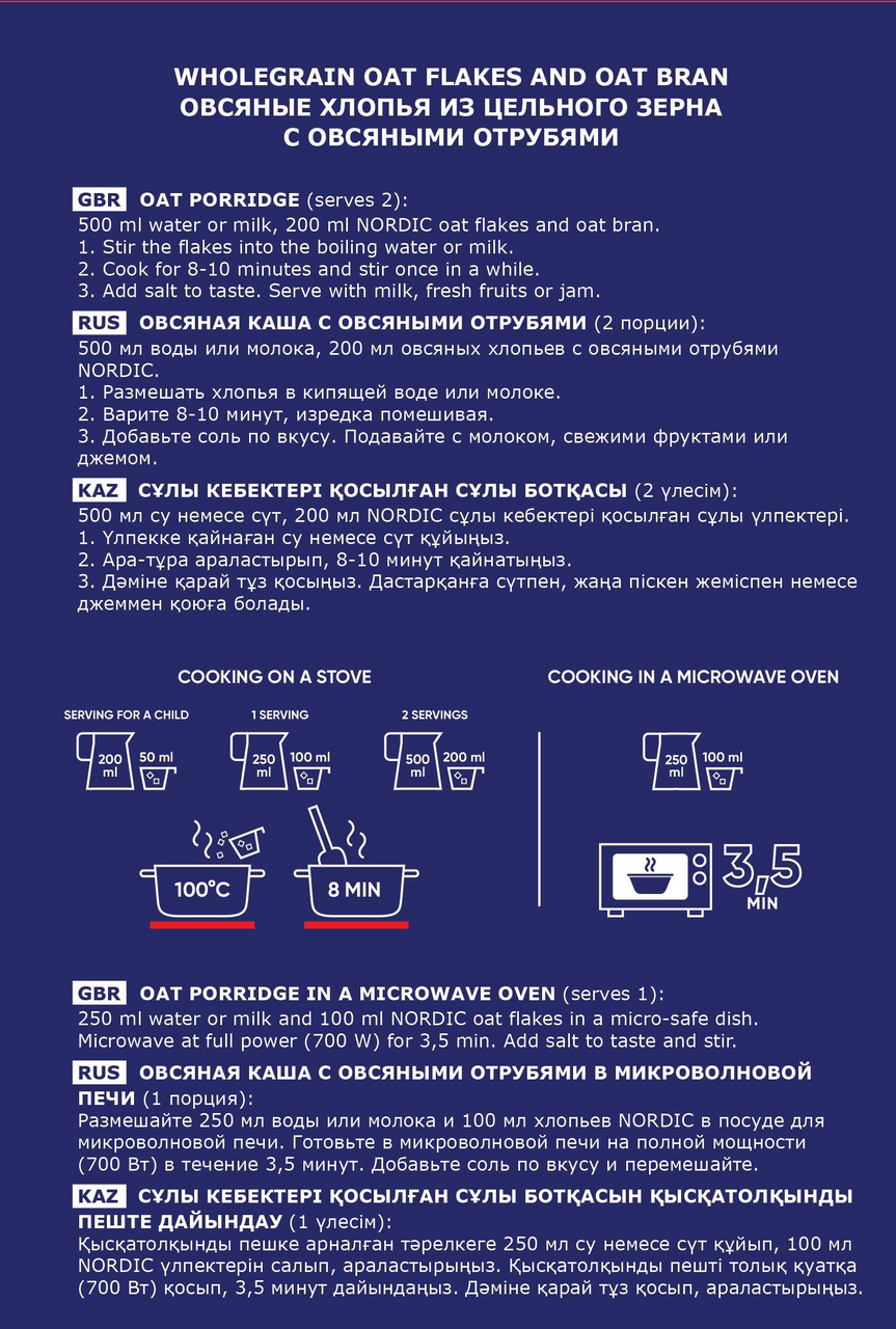 Хлопья Овсяные с овсяными отрубями 500 г. Хлопья Nordic Овсяные с отрубями 500 г - сочетание полезного и, вместе с тем, вкусного питания. В овёс добавлены отруби, которые придают оригинальную нотку и делают кашу в разы полезнее. Овёс богат растительным белком, углеводами, являющимися источником энергии для организма. Особая технология производства сохраняет 95% полезных качеств данного продукта. Способ приготовления: 1 часть хлопьев высыпать в емкость, залить 4 частями горячей воды или горячего молока, варить в течении 3-х минут, добавить по вкусу соль, сахар, масло или другие продукты.