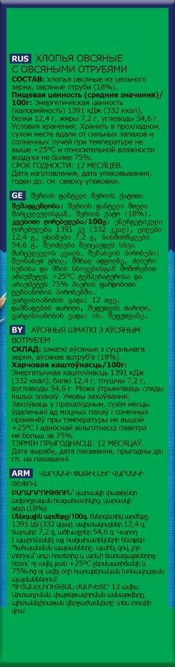 | Состав | Хлопья овсяные из цельного зерна, не содержащие глютен. |
