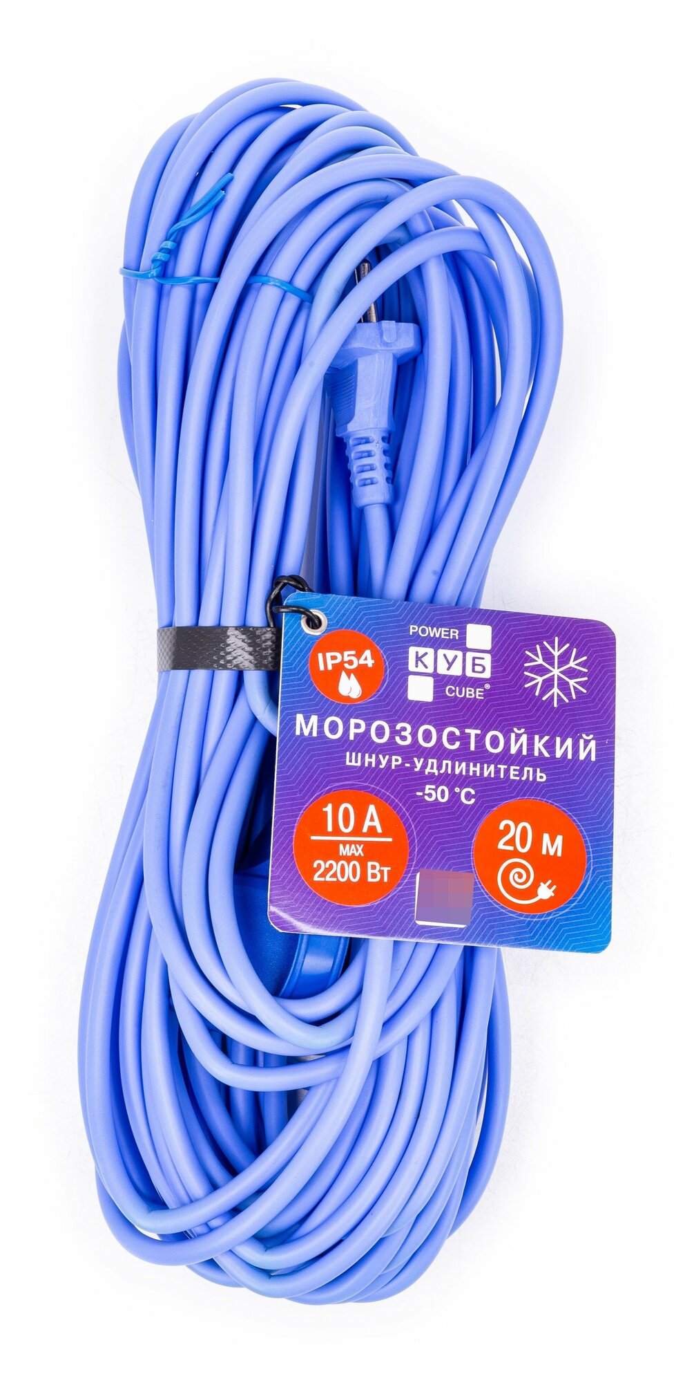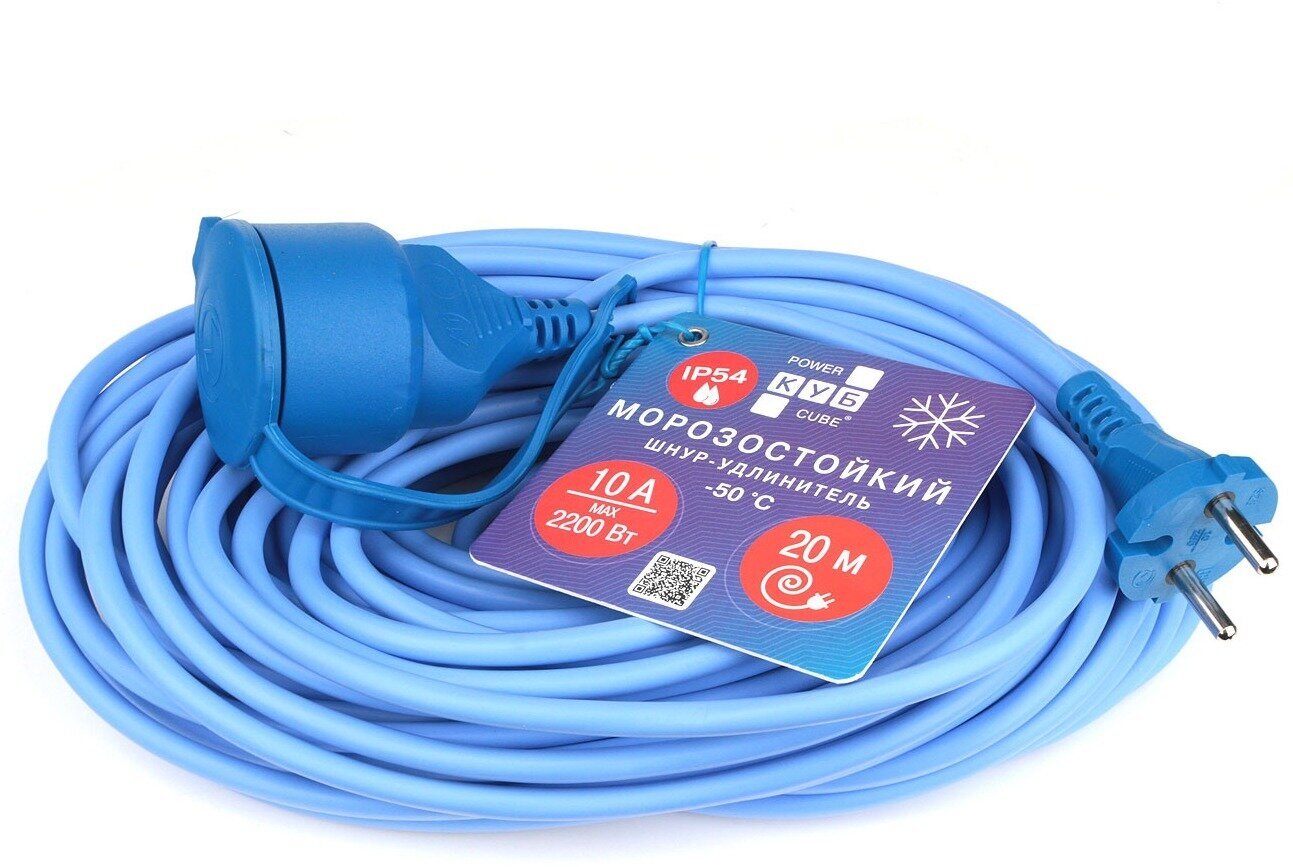 Удлинитель PowerCube в бухте PC 10А 20м (PC-1F-R-20(IP)) из термопластичного морозостойкого эластомера сохраняет гибкость и эластичность при температуре до -50 °С. Без заземления.