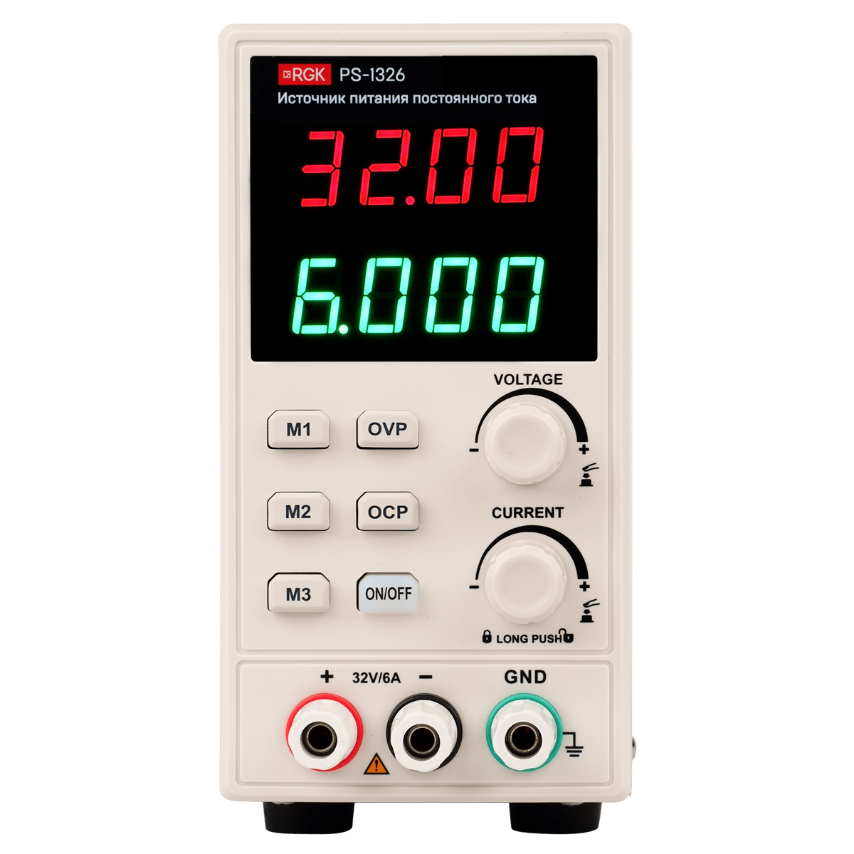 Прибор используется для диагностики, настройки и контроля качества устройств постоянного тока.Источник питания позволяет установить напряжение в диапазоне 0,01 В - 32 В и силу тока 0,001 А до 6 А. Устройство может работать от сети 110 В или 220 В, переключатель формата питания расположен на задней стороне корпуса.Источник питания RGK 754699 - доступное решение для сервисных центров по ремонту электроники, научно-технических лабораторий и радиолюбителей. Прибор используется для диагностики, настройки и контроля качества устройств постоянного тока.Источник питания позволяет установить напряжение в диапазоне 0,01 В - 32 В и силу тока 0,001 А до 6 А. Может работать от сети 110 В или 220 В.Компактные размеры. Источник питания постоянного тока RGK занимает совсем немного места на столе или в инструментальной стойке. При необходимости его легко можно переносить с места на место.Функция памяти. Прибор может запомнить до трех сочетаний тока и напряжения, которые назначаются на кнопки M1/M2/M3.