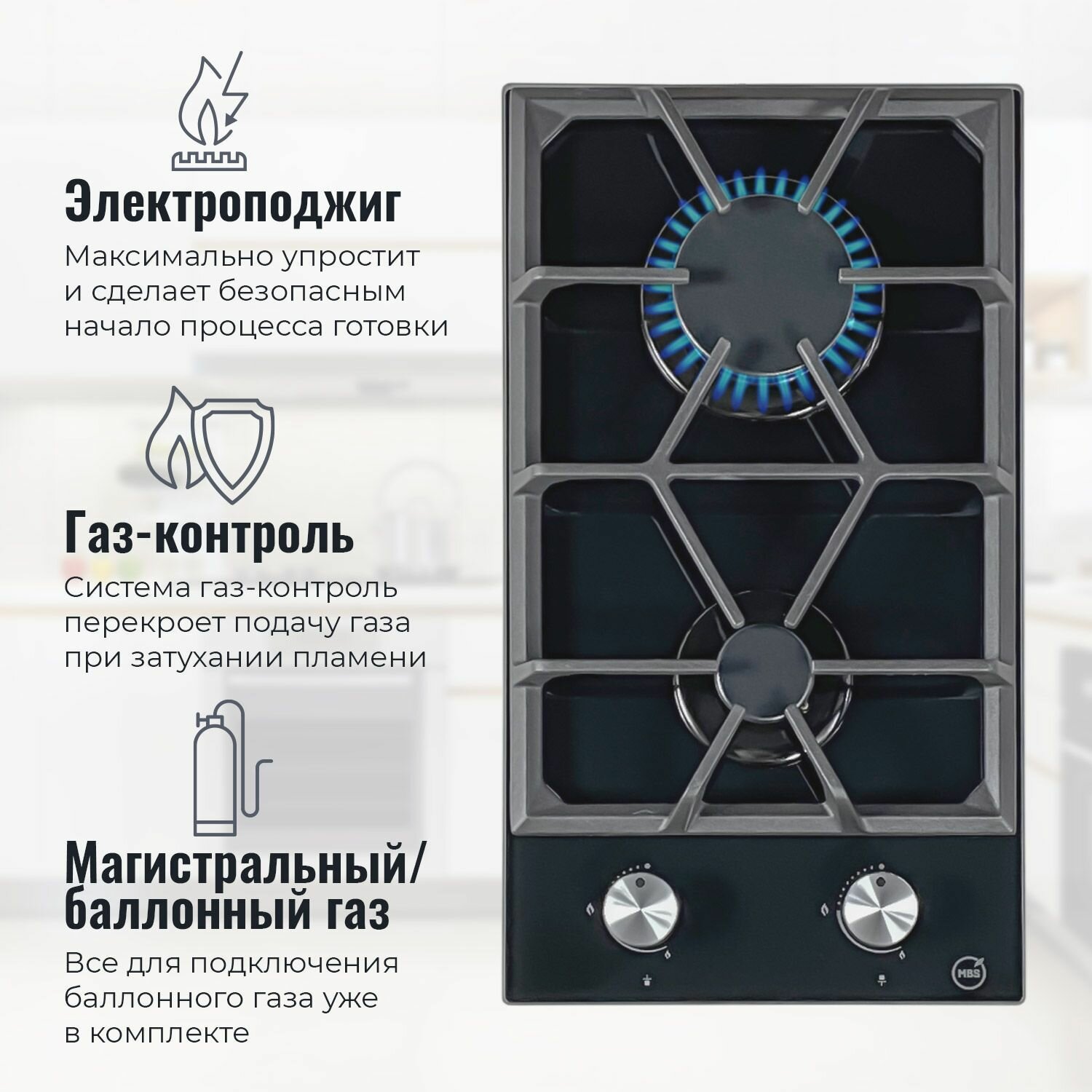 Встраиваемая газовая варочная поверхность прекрасно поместится как на кухне самых небольших размеров, так и будет удобна на даче или в качестве второй поверхности на большой кухне. Ее современный дизайн с жаропрочным стеклом белого цвета и чугунными решетками будет смотреться уместно в интерьере любой современной кухни, а подключается она как к магистральному, так и к баллонному газу. Газовая варочная поверхность оснащается двумя конфорками, электроподжигом и комплектом дополнительных жиклеров (форсунок) для подключения к баллонному газу. При желании вы также можете докупить к этой поверхности держатель для сковороды ВОК, подставку для турки и специальный противень для приготовления гриля. За безопасность использования этой поверхности отвечает система газ-контроль. Вся кухонная техника бренда MBS соответствует всем современным европейским стандартам, а гарантия производителя составляет 3 года.
