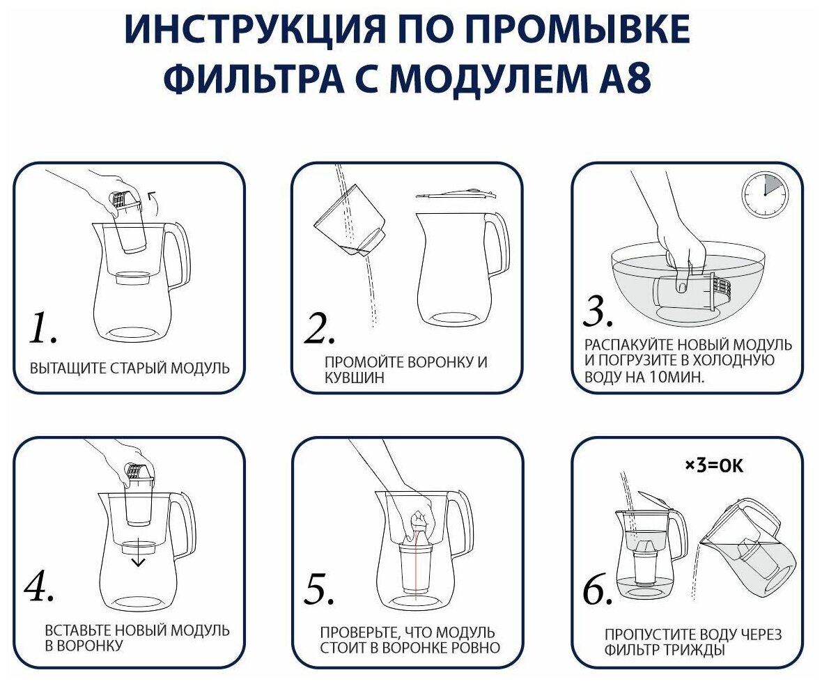 | Особенности | модуль A8 не забивается раньше времени, даже если вода ржавая и мутная, он продолжает очищать воду от видимых и растворенных примесей, даже таких, как остатки медицинских препаратов, включая антибиотики и гормоны |