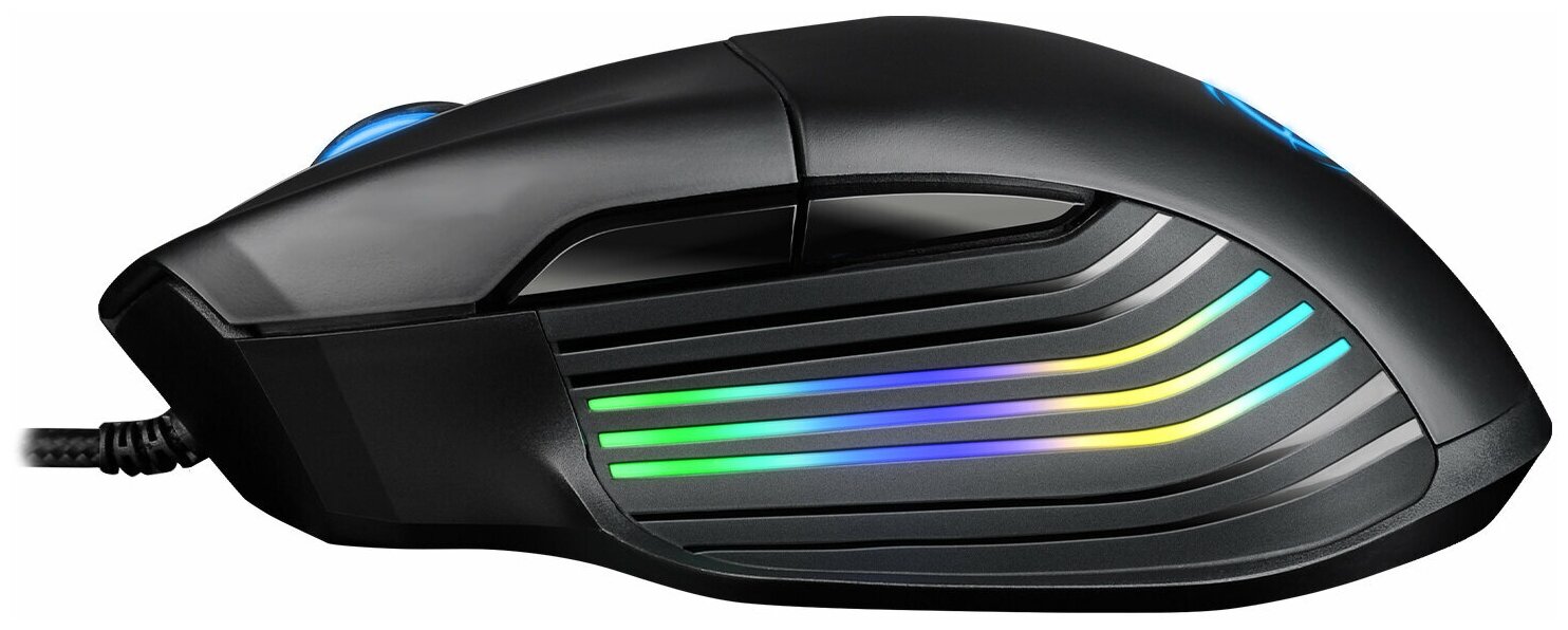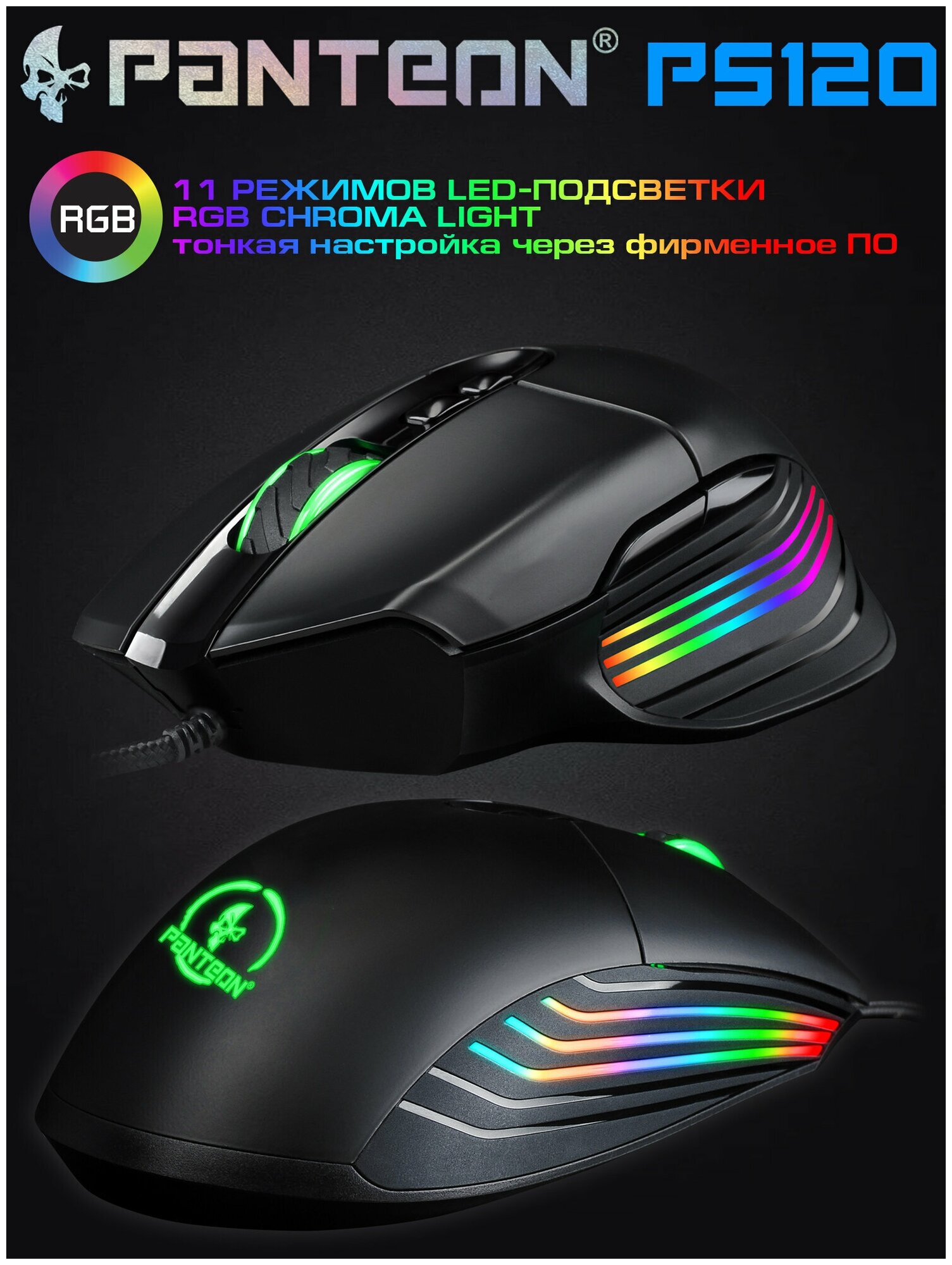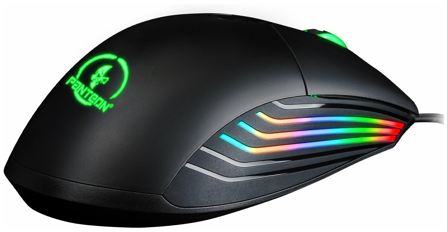 PANTEON Сенсор PIXART 3327 с микроконтроллером Высококачественный игровой сенсор от компании PIXART обеспечивает высокую точность позиционирования курсора, а также мгновенную реакцию на движение руки пользователя. 6200 DPI Физическое разрешение сенсора составляет 6400 DPI. Предустановленные уровни – 200/ 800/ 1600 / 3200/ 4000/ 6200 DPI. При использовании фирменного программного обеспечения всегда можно произвести тонкую настройку уровней разрешения сенсора от 200 DPI до 12000 DPI с шагом в 100 DPI. 220 IPS / 30 G показатели скорости движения и ускорения близки к максимальным возможностям человеческой руки, а значит «сорвать» сенсор будет крайне сложно. 125/250/500/1000 Гц уровни настройки частоты опроса шины. Выбор производится как с помощью программного обеспечения, так и с использованием кнопки на нижней части устройства. Ультрагладкие тефлоновые ножки Ножки выполнены из тефлона высочайшего качества, тщательно обработаны, края скруглены, без всяких неровностей и заусенцев, поэтому мышь скользит как по маслу. Подсветка Свечение RGB CHROMA LIGHT на боковых частях мыши мыши работает в 11различных режимах. Переключение режимов осуществляется кнопкой на верхней части мыши рядом с колесом подсветки. Контурную подсветку можно также полностью отключить. Колесико и логотип оснащены однотонной подсветкой, которая меняется и настраивается в зависимости от уровней разрешения сенсора. Программное обеспечение позволяет тонко настраивать устройство, а также записывать макросы для всех кнопок мыши. Особое, шероховатое на ощупь, антискользящее покрытие верхней панели мыши идеально для уверенного хвата, даже если рука становится влажной в процессе горячих игровых схваток.