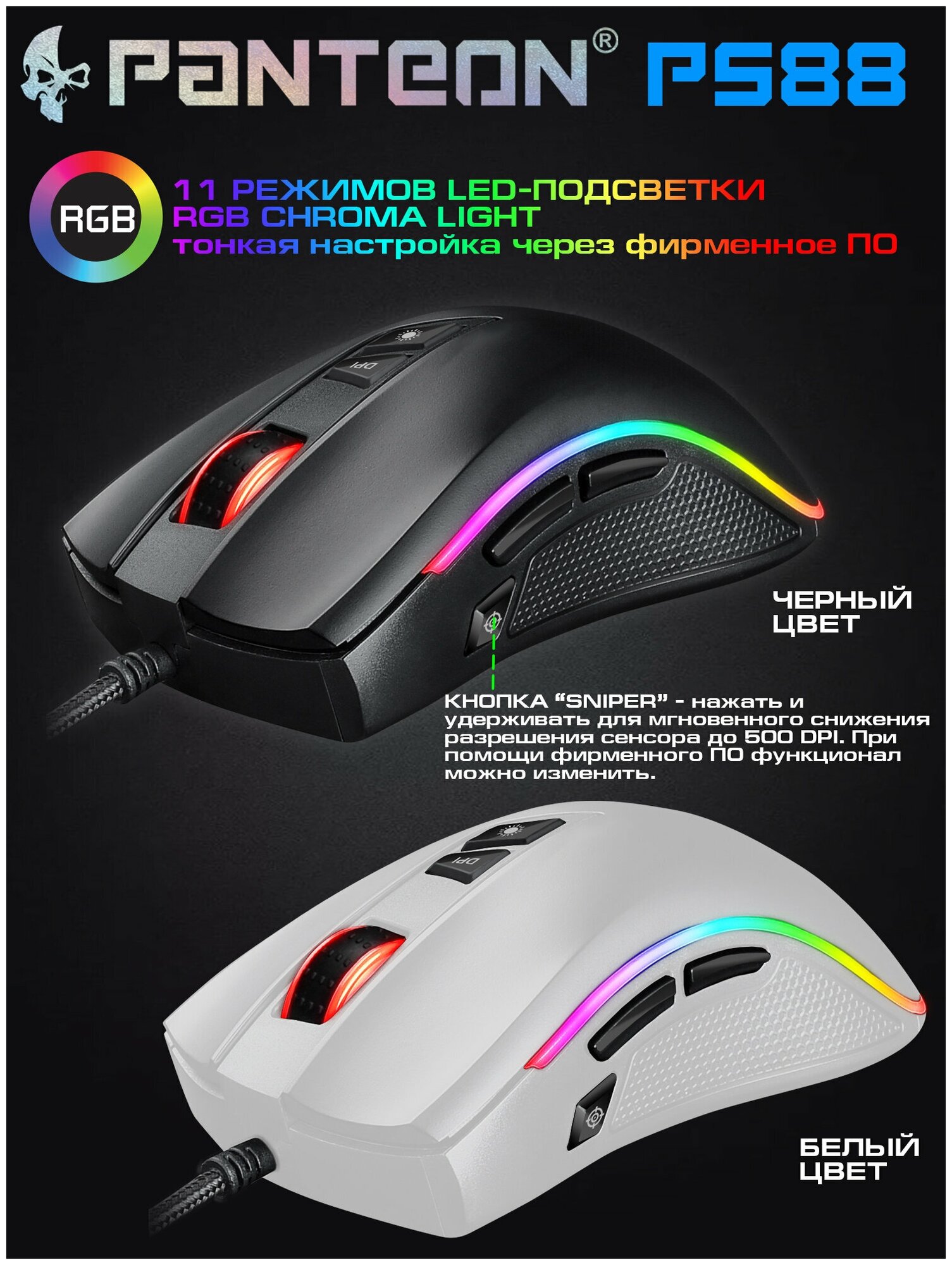 PANTEON PS88 Сенсор PIXART 3327 с микроконтроллером Высококачественный игровой сенсор от компании PIXART обеспечивает высокую точность позиционирования курсора, а также мгновенную реакцию на движение руки пользователя. 6200 DPI Физическое разрешение сенсора составляет 6200 DPI. Предустановленные уровни – 200/ 800/ 1600 / 3200/ 4000/ 6200 DPI. При использовании фирменного программного обеспечения всегда можно произвести тонкую настройку уровней разрешения сенсора от 200 DPI до 12000 DPI с шагом в 100 DPI. 220 IPS / 30 G показатели скорости движения и ускорения близки к максимальным возможностям человеческой руки, а значит «сорвать» сенсор будет крайне сложно. 125/250/500/1000 Гц уровни настройки частоты опроса шины. Выбор производится как с помощью программного обеспечения, так и с использованием кнопки на нижней части устройства. Подсветка LED CHROMA LIGHT Подсветка по контуру мыши работает в 11 различных режимах. Переключение режимов осуществляется кнопкой на верхней части корпуса мыши рядом с колесом прокрутки. Контурную подсветку можно также полностью отключить. Колесико и логотип оснащены однотонной подсветкой, которая меняется и настраивается в зависимости от уровней разрешения сенсора. Программное обеспечение позволяет тонко настраивать устройство, а также записывать макросы для всех кнопок мыши. Сменное правое крыло в комплекте В зависимости от предпочтений можно установить более широкое или наоборот, более компактное крыло. Благодаря магнитному креплению панели надежно закрепляются на корпусе мыши, и в то же время легко меняются.