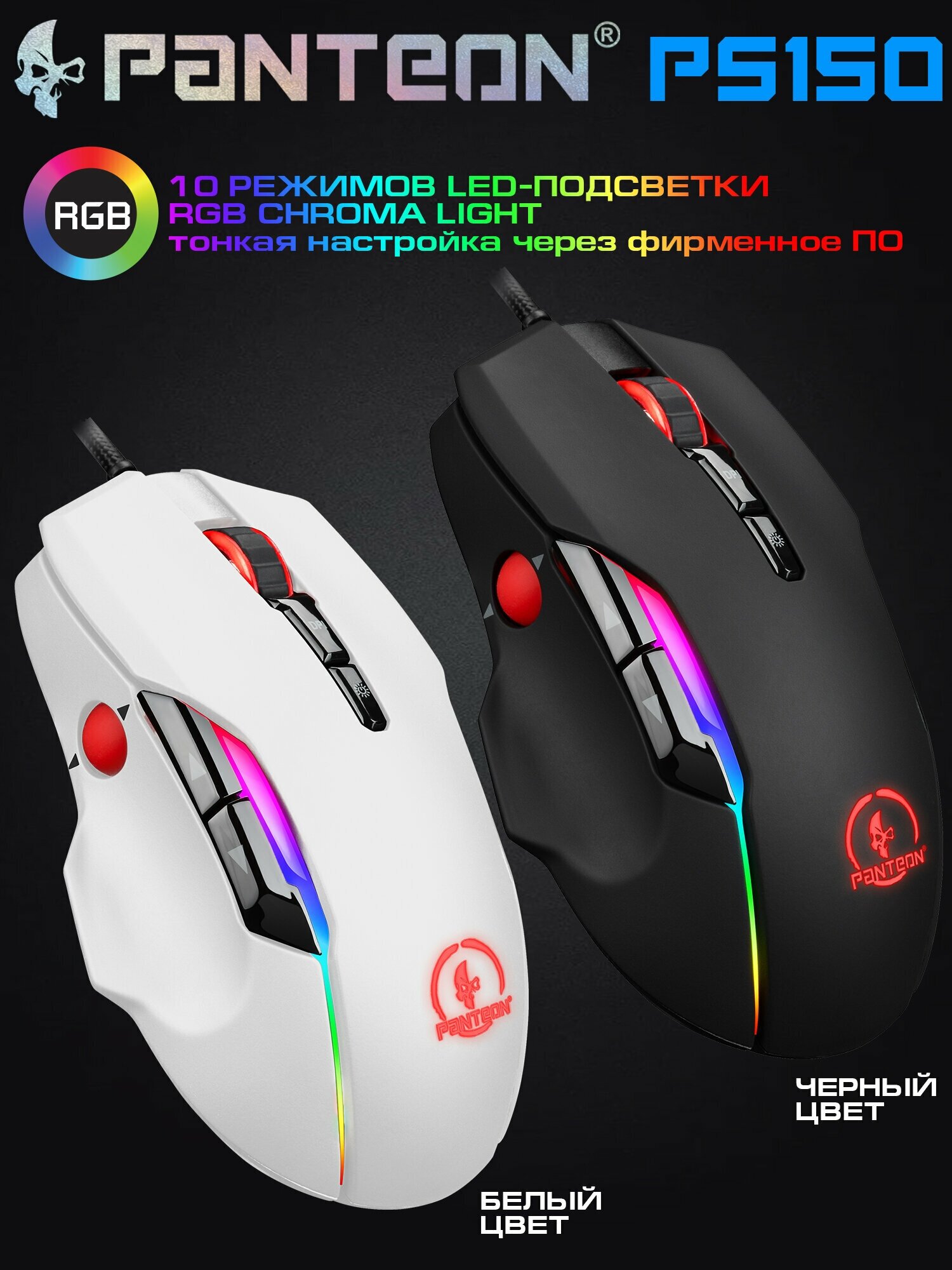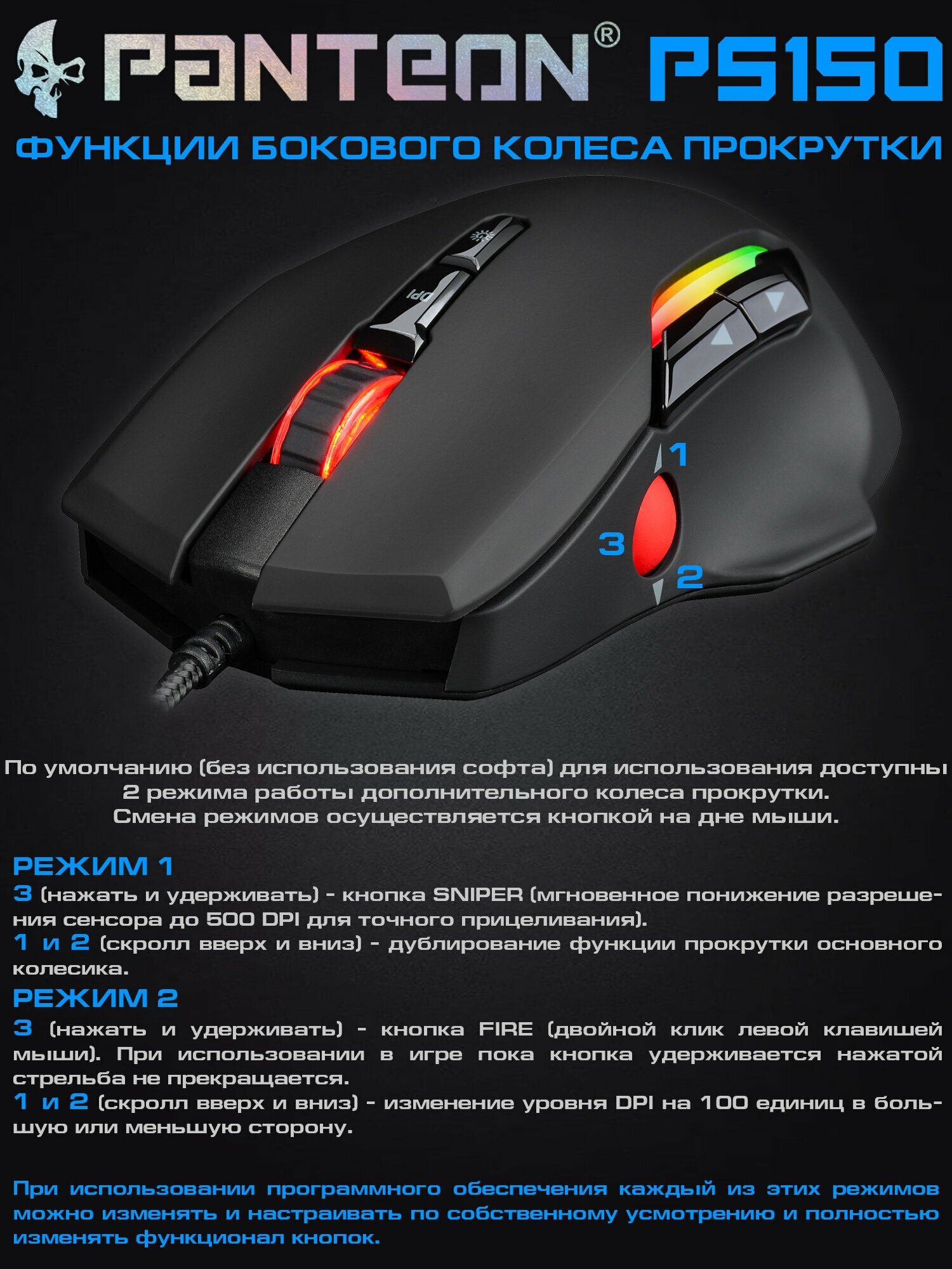 Сенсор PIXART 3355 с оригинальной линзой Использование новейшего игрового сенсора premium-уровня Pixart 3355 в комплекте с оригинальной линзой Pixart позволяет добиться максимально возможной эффективности работы сенсора. Такое решение обеспечивает предельную точность считывания, изначально заложенную производителем, а значит филигранную работу устройства на всех игровых поверхностях. 400 IPS / 40 G По данным исследований профессиональный геймер может перемещать мышь со скоростью до 250 IPS и ускорением до 30 G. Максимальные показатели скорости движения и ускорения корректно считываемые сенсором PIXART 3355 значительно превосходят возможности руки даже профессионального геймера, а значит «сорвать» сенсор будет практически невозможно. Регулировка высоты отрыва (1мм/2мм) Настройка осуществляется кнопкой на нижней части устройства. В зависимости от особенностей геймплея игрок всегда может отрегулировать, на какой высоте над поверхностью мышь перестает ее считывать. Минимальные значения позволяют возвращать мышь в нужную точку коврика без смещения курсора. 16 000 DPI Максимальное физическое разрешение сенсора составляет 16000 DPI. Предустановленные для кнопки DPI уровни – 200 / 800 / 1200 / 3200 / 8000 / 16000 DPI. При использовании фирменного программного обеспечения всегда можно произвести тонкую настройку уровней разрешения сенсора от 100 DPI до 32000 DPI с шагом в 100 DPI. Подсветка Свечение LED CHROMA LIGHT работает в 10 различных режимах. Переключение режимов осуществляется кнопкой рядом с основным колесом прокрутки. Боковую подсветку можно также полностью отключить. Колесико и логотип оснащены однотонной подсветкой, которая меняется и настраивается в зависимости от уровней разрешения сенсора. Программное обеспечение позволяет тонко настраивать устройство, а также записывать макросы для всех кнопок мыши. Боковое колесо прокрутки По умолчанию (без использования программного обеспечения) для использования доступны 2 режима работы дополнительного колеса прокрутки. Смена режимов осуществляется кнопкой на дне мыши. Режим 1 3 (нажать и удерживать) - кнопка SNIPER (мгновенное понижение разрешения сенсора до 500 DPI для точного прицеливания). 1 и 2 (скролл вверх и вниз) - дублирование функции прокрутки основного колесика. Режим 2 3 (нажать) - кнопка FIRE (двойной клик левой клавишей мыши). При использовании в игре пока кнопка удерживается нажатой стрельба не прекращается. 1 и 2 (скролл вверх и вниз) - изменение уровня DPI на 100 единиц в большую или меньшую сторону. При использовании программного обеспечения доступны 4 предустановленных режима, созданных для гейминга, офисной работы, а также мультимедийный режим. Каждый из этих режимов можно изменять и настраивать по собственному усмотрению и полностью изменять функционал кнопок.