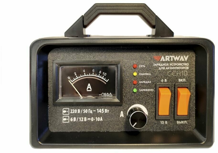 Artway CCH10 - это электронное зарядное устройство для зарядки электрических аккумуляторов и аккумуляторных батарей различных типов. Устройство может использоваться для зарядки аккумуляторов напряжением 6 В и 12 В емкостью до 100 Ач. Зарядное устройство обладает плавной регулировкой тока заряда, что позволяет бережно и эффективно заряжать аккумуляторы различных типов и емкостей. Амперметр, встроенный в устройство, позволяет контролировать процесс заряда и следить за состоянием аккумулятора. Защита от неправильного подключения к клеммам аккумулятора и от перегрева, а также защита от короткого замыкания обеспечивают безопасность использования устройства. Кроме того, зарядное устройство CCH10 имеет компактные габариты и малый вес, что делает его удобным для использования и хранения. Мощность зарядного устройства составляет 145 Вт, а напряжение заряжаемого аккумулятора может быть как 6 В, так и 12 В. Ток зарядки может быть регулирован в диапазоне от 0 А до 10 А. Автомобильное зарядное устройство может использоваться как для аккумуляторов автомобилей и других транспортных средств, так и для зарядки аккумуляторов бытовых устройств, таких как мотоциклы, лодки, садовые инструменты и т.д. Зарядное устройство Artway CCH10 - это надежный и удобный инструмент для зарядки аккумуляторов различных типов и емкостей, который обеспечивает безопасность и эффективность зарядки.