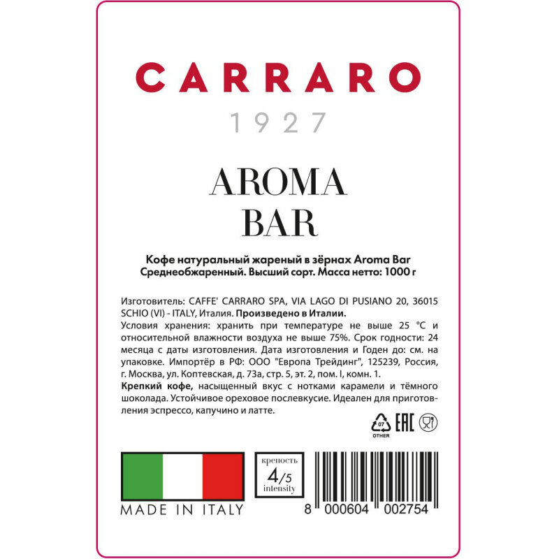 Кофе в зернах Carraro Aroma Bar 1000г