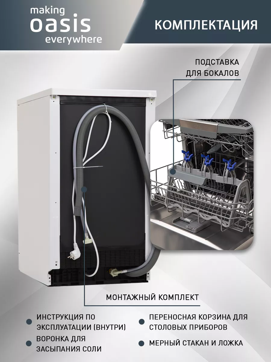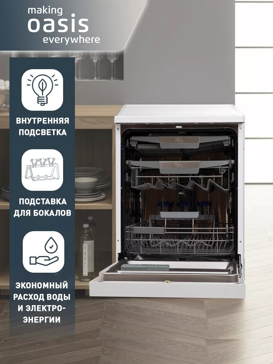 Посудомоечная машина способна эффективно очистить от загрязнений за один цикл до 14 комплектов кухонной посуды в зависимости от модели. Посудомойка в процессе эксплуатации характеризуется низким уровнем шума, поэтому комфортна в использовании даже в ночное время. Машина для мойки посуды обладает удобными функциями – 6 автоматических программ, отложенный старт и регулировка корзины для посуды по высоте, что делает мытье посуды еще проще. Благодаря регулируемой высоте корзины в рабочую камеру устройства удобно загружать посуду нестандартного размера. Для безопасного и эффективного использования посудомоечная машина 60 см оснащена системой защиты от протекания и экономным расходом воды и электроэнергии. Удобный цифровой дисплей с крупной индикацией позволит сделать процесс взаимодействия с посудомоечной машиной еще более комфортным и простым. Посудомоечная машина отдельностоящая оснащена индикаторами, которые позволяют контролировать наличие соли и ополаскивателя. А наличие внутренней подсветки создает удобство в темное время суток. Посудомоечные машины making Oasis everywhere обеспечивают идеальный результат мытья и сушки посуды.
