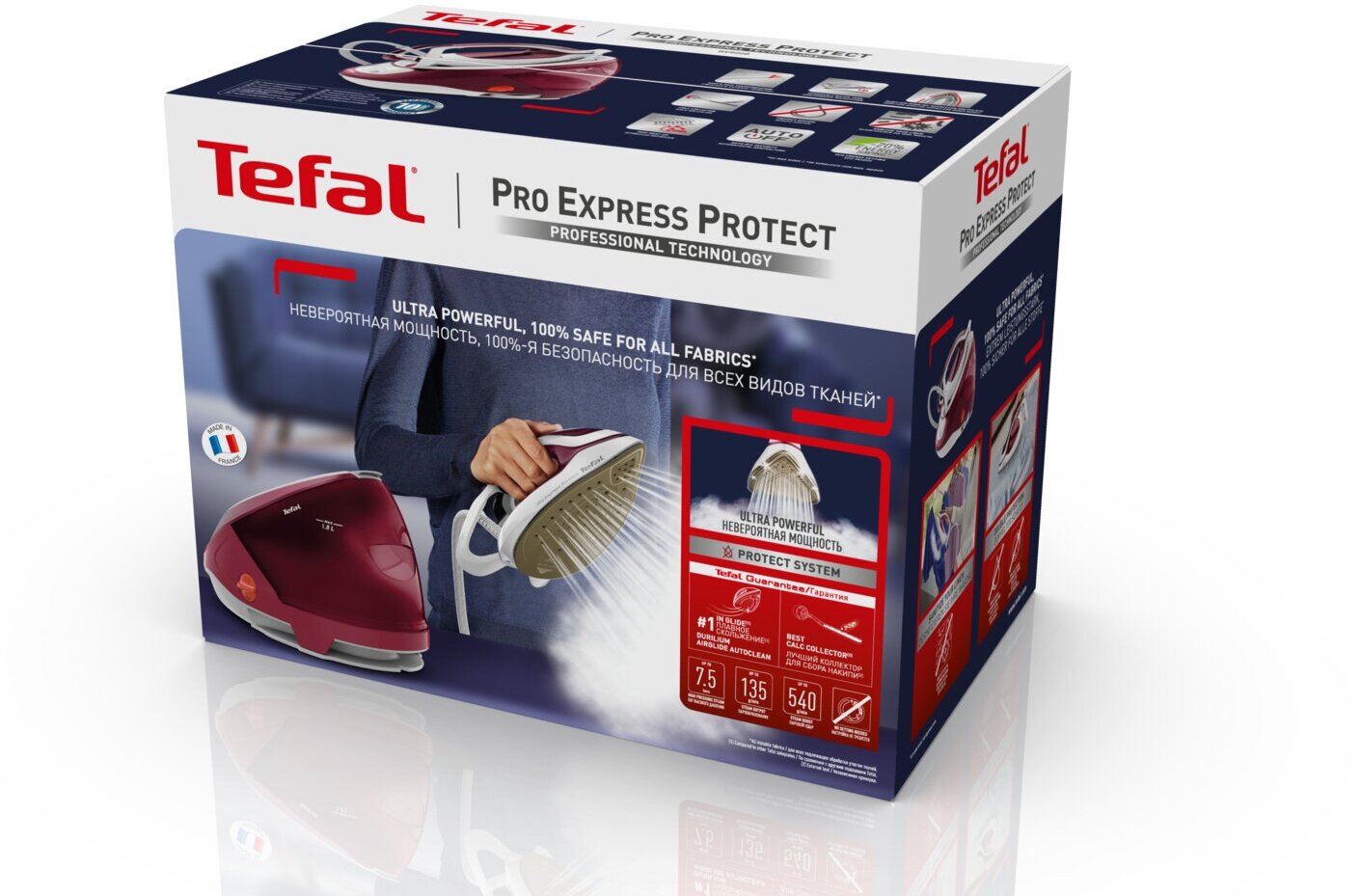 Невероятно мощный и безопасный парогенератор. Парогенератор Pro Express Protect подарит вашим вещам бережный и качественный уход благодаря невероятно мощной подаче пара. Бойлер высокого давления обеспечивает профессиональные качество и эффективность при каждом использовании. Эксклюзивная двойная система защиты сохраняет безупречный внешний вид ваших вещей. Интеллектуальная система гарантирует безопасное глажение без дополнительных настроек и риска прожечь ткани. Парогенератор Pro Express Protect подарит вашим вещам профессиональное качество ухода, а вам – всегда безупречный стиль. Парогенератор создает давление 7,5 бар и подает постоянный пар со скоростью 135 г/мин, делая каждое глажение более быстрым и эффективным. Интенсивный паровой удар до 540 г/мин помогает разглаживать самые стойкие складки и плотные ткани. Съемный резервуар для воды объемом 1,8 л легко снимается, и его можно наполнять во время работы устройства. Технология Protect System обеспечивает идеально чистое глажение – без неожиданных пятен на одежде, а запатентованная система защиты от накипи поддерживает высокую производительность парогенератора надолго. Благодаря системе No-Setting устройство работает без дополнительных настроек и гарантирует 100% безопасность для всех типов тканей без риска их прожечь. Высокая температура нагрева подошвы и мощный пар уничтожают до 99% микробов и бактерий, которые могут появиться в тканях, и гарантируют гигиеническую чистоту вашей одежды.