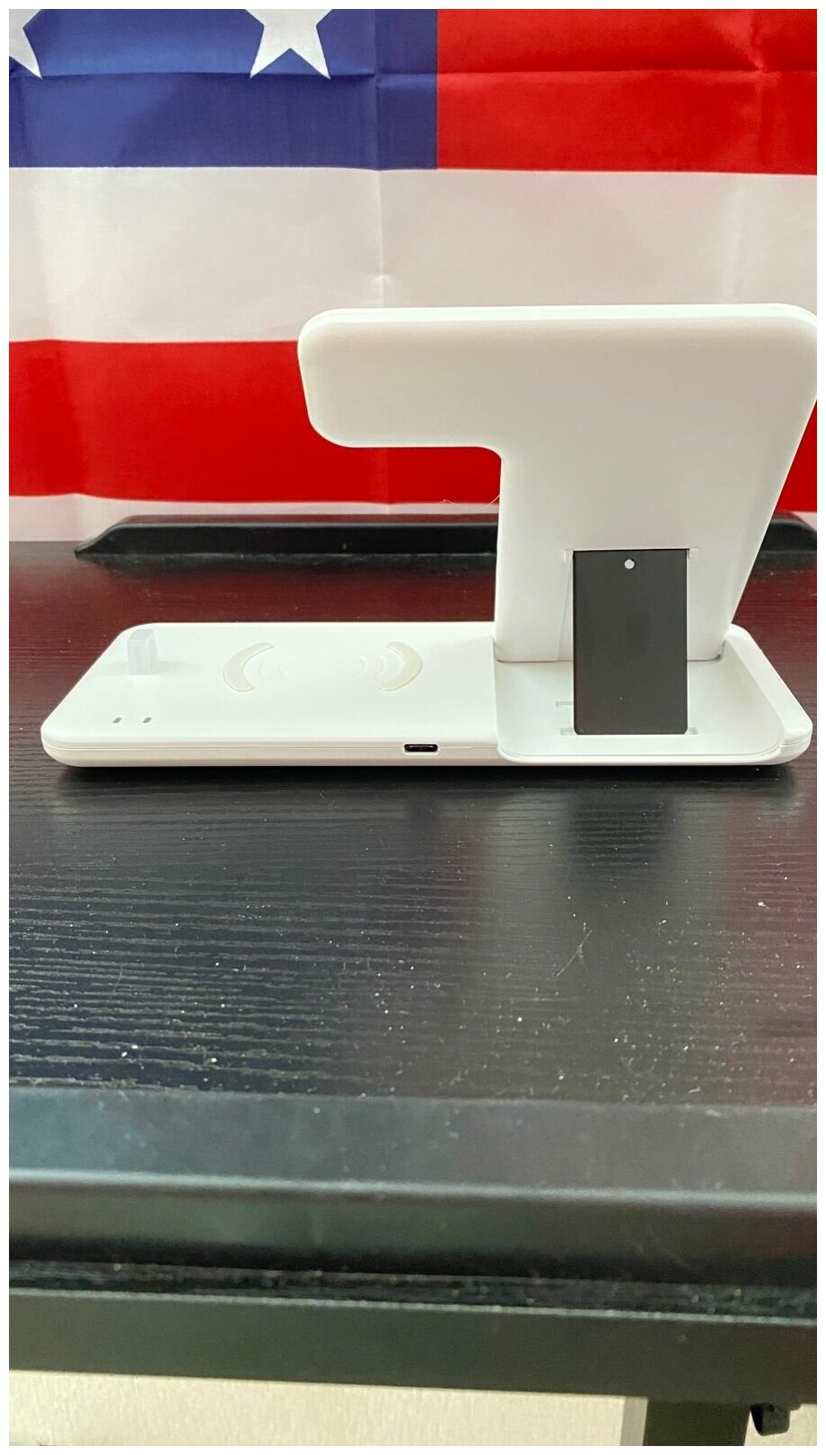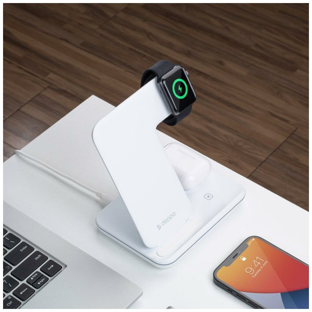 Беспроводная зарядная станция 3 в 1 идеально дополнит ваше рабочее место. Заряжайте все ваши устройства одновременно, с комфортом и без лишних проводов. Достаточно подключить станцию к сети и разместить на ней iPhone, Apple Watch и Airpods, зарядка начнётся автоматически, а каждое из устройств получит максимум мощности. Быстрая беспроводная зарядка: 15 Вт для смартфона. Максимальная возможная мощность зарядки для iPhone. Интеллектуальная защита системы заряда всех устройств Новый контроллер позволяет стабильно заряжать Apple Watch любого поколения Для работы необходимо сетевое зарядное устройство с поддержкой «быстрой зарядки» 20 Вт или более