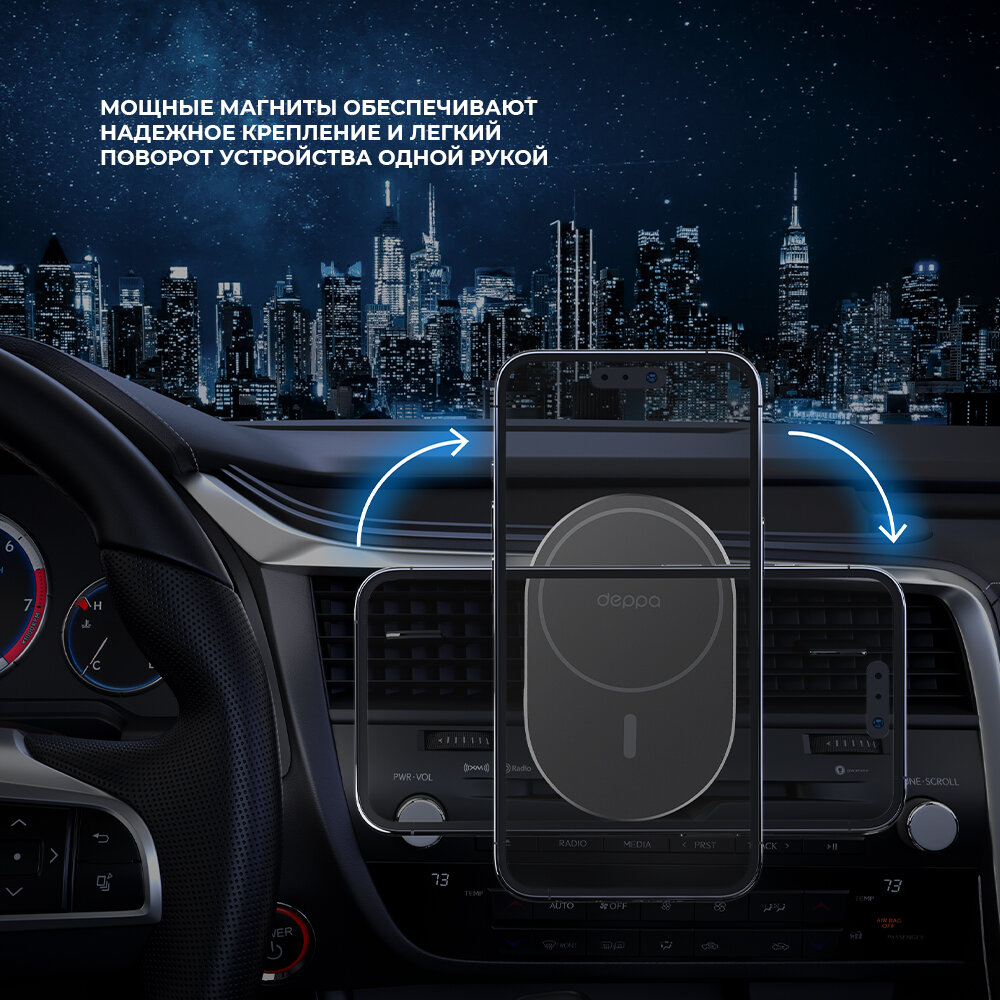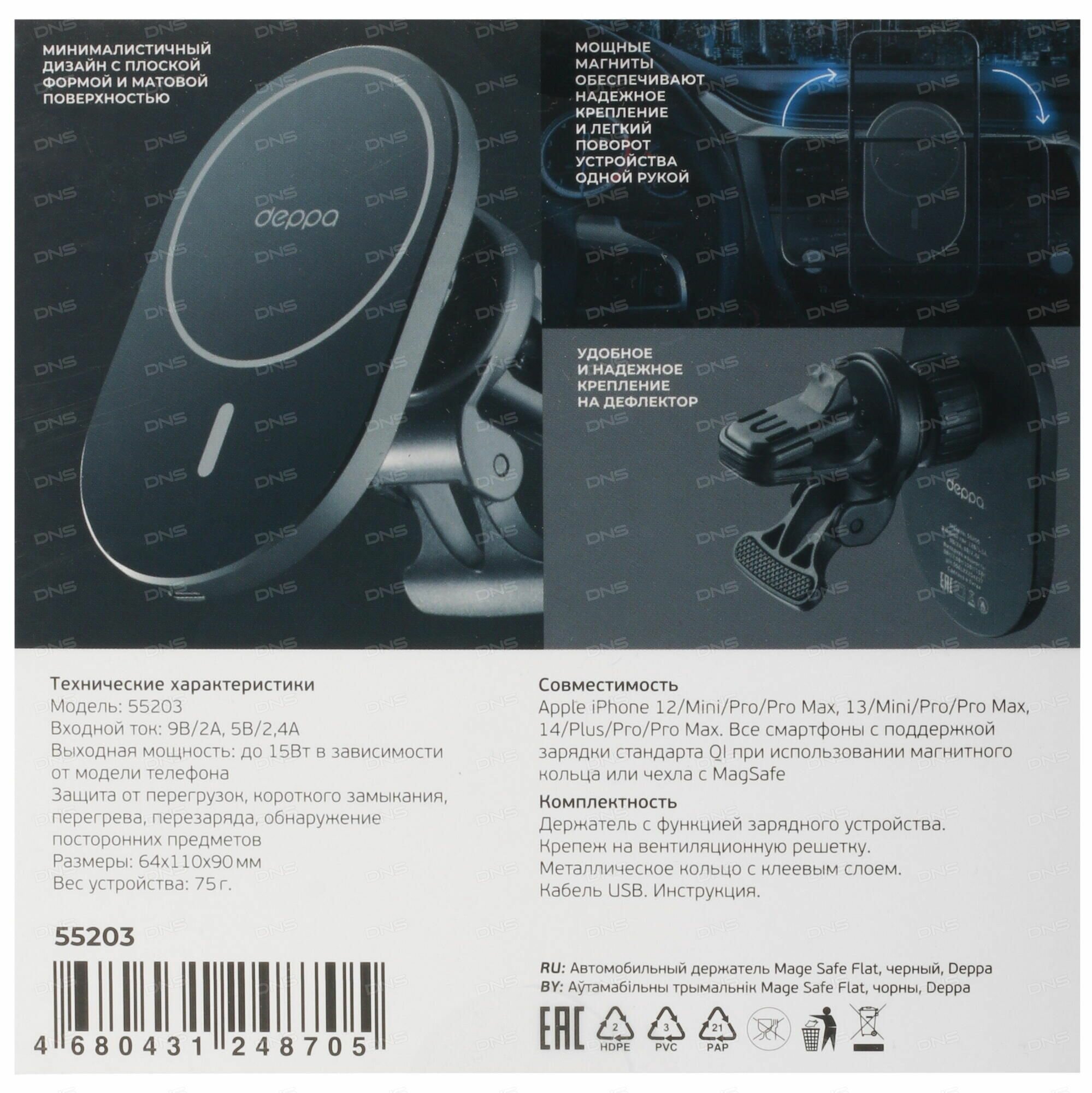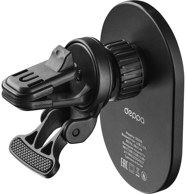 | Дополнительная информация | крепление MagSafe для iPhone Быстрая беспроводная зарядка Крепление на вентиляционную решетку с упором Настраиваемый угол наклона смартфона Возможность поворота на 360 градусов Входной ток DC 9В/2A, 5В/2.4A Выходная мощность 15 Вт / 10 Вт / 7.5 Вт / 5 Вт Допустимая толщина чехла до 4 мм Размеры поверхности 63*100 мм Встроенная защита от перегрева, короткого замыкания, превышения допустимого напряжения, перезаряда Вес 75г. |