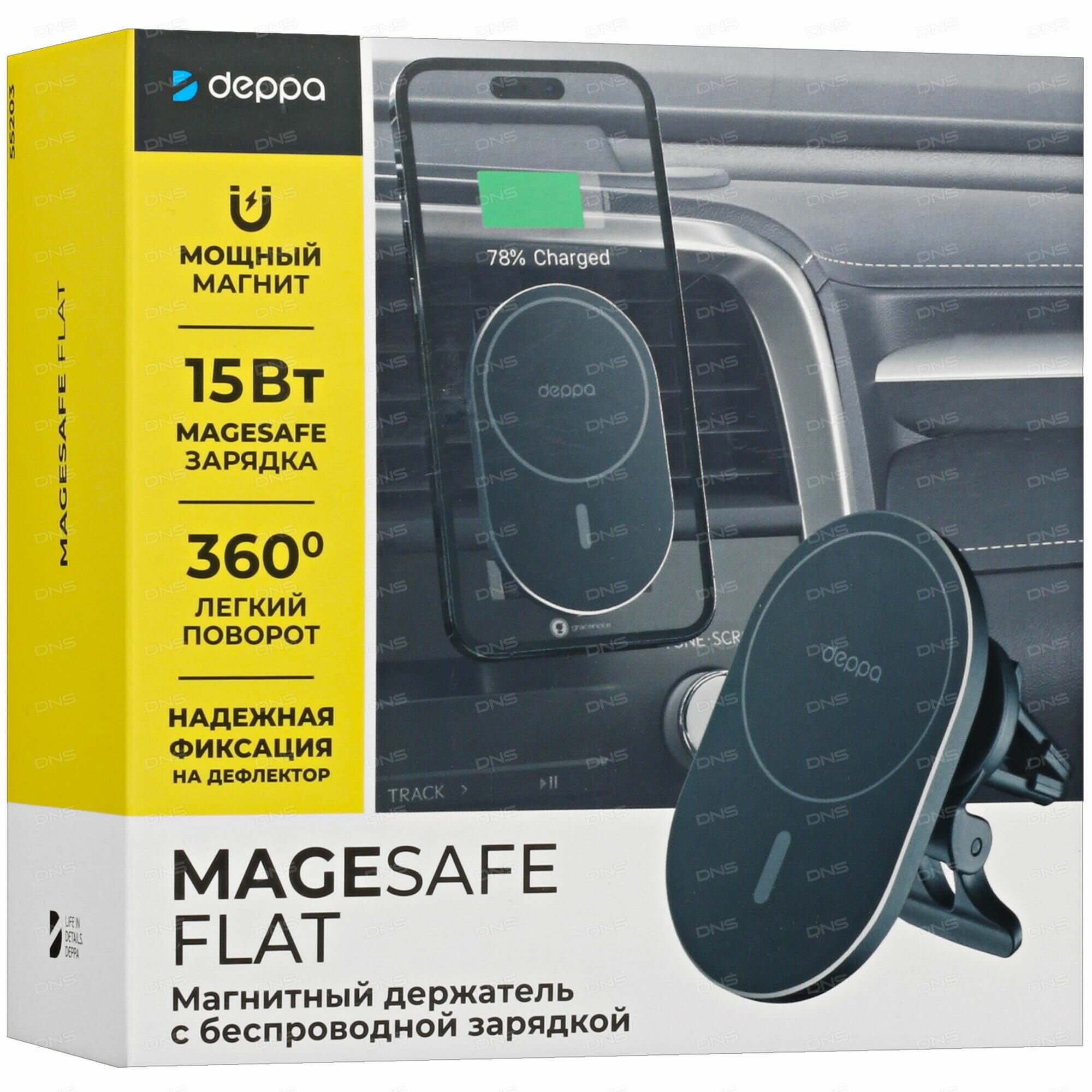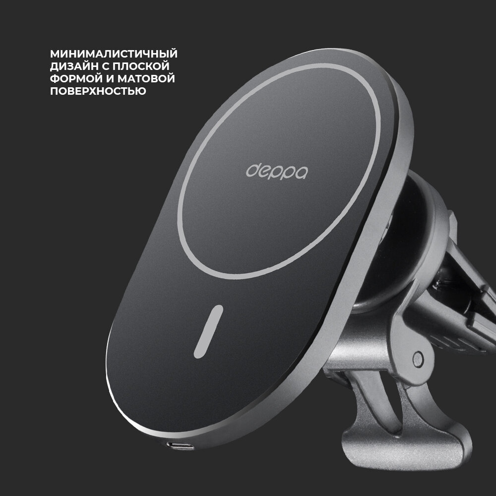 Мощность Qi-зарядки — 15 Вт. Крепление к вентиляционной решетке с упором: будет идеально держаться почти на любом воздуховоде. Мощные магниты, аналогичные оригинальным MagSafe: подойдет для любой версии iPhone 12 и новее. Отлично выглядит и качественно собран: достоин быть лучшим аксессуаром для iPhone. Автомобильный держатель Mage Safe Flat Крепление MagSafe для iPhone Быстрая беспроводная зарядка Крепление на вентиляционную решетку с упором Настраиваемый угол наклона смартфона Возможность поворота на 360 градусов Входной ток: DC 9В/2A, 5В/2.4A Выходная мощность: 15 Вт / 10 Вт / 7.5 Вт / 5 Вт Допустимая толщина чехла: до 4 мм Размеры поверхности: 63*100 мм Встроенная защита: от перегрева, короткого замыкания, превышения допустимого напряжения, перезаряда Вес: 75г.