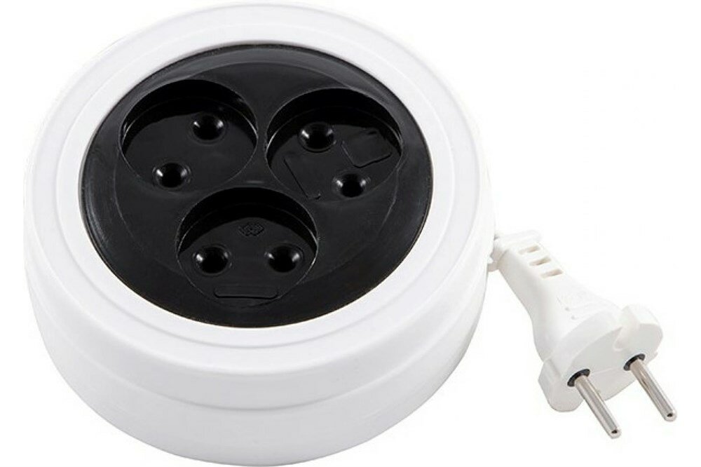 Универсальный удлинитель-рулетка без заземления. Конструкция предусматривает полную или частичную смотку сетевого шнура внутрь корпуса. Оснащен 3 розетками для подключения сразу нескольких электроприборов.