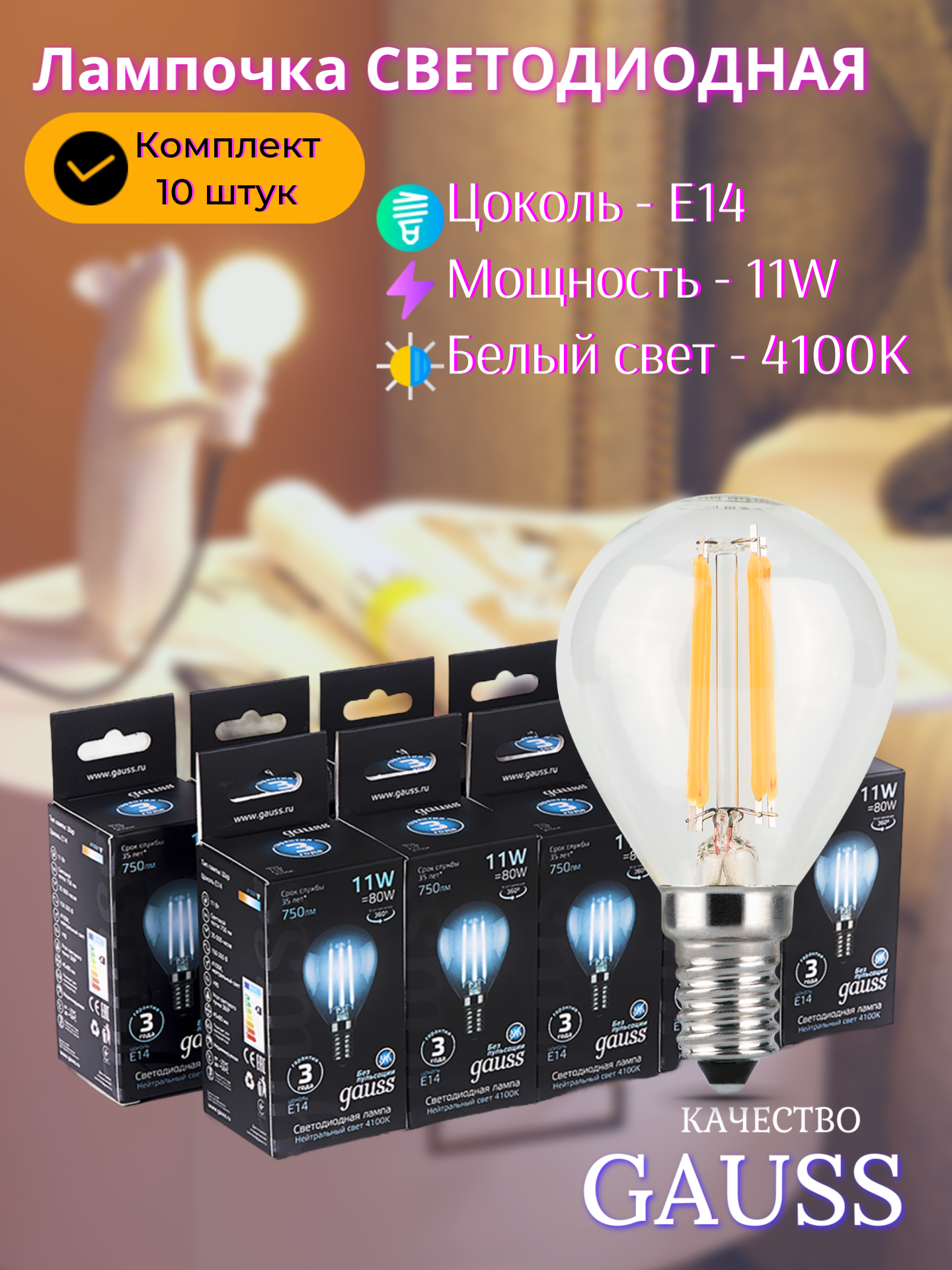 Светодиодная лампа Gauss - самый безопасный для здоровья и окружающей среды источник света. Она не пульсирует, мгновенно включается, не содержит ртути, и имеет больший срок службы, чем лампы накаливания и КЛЛ.