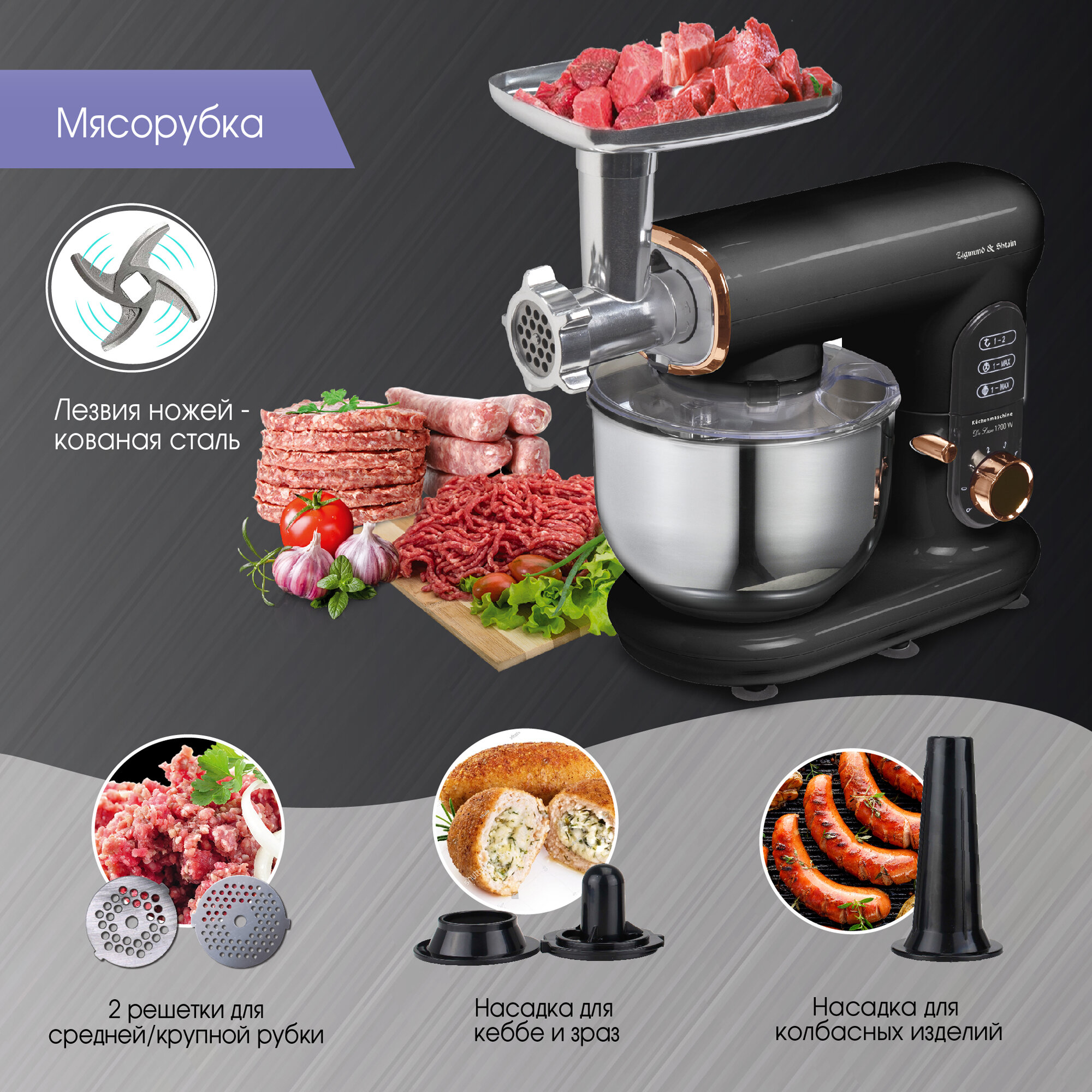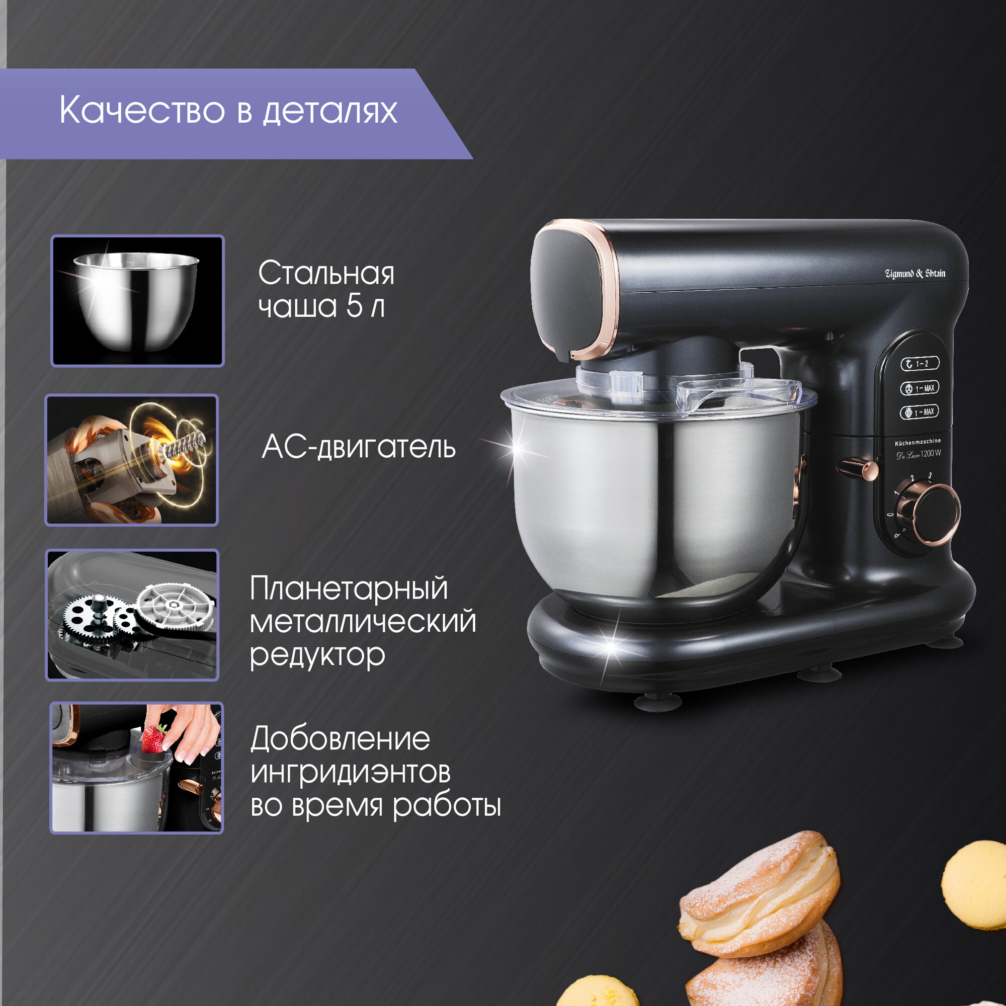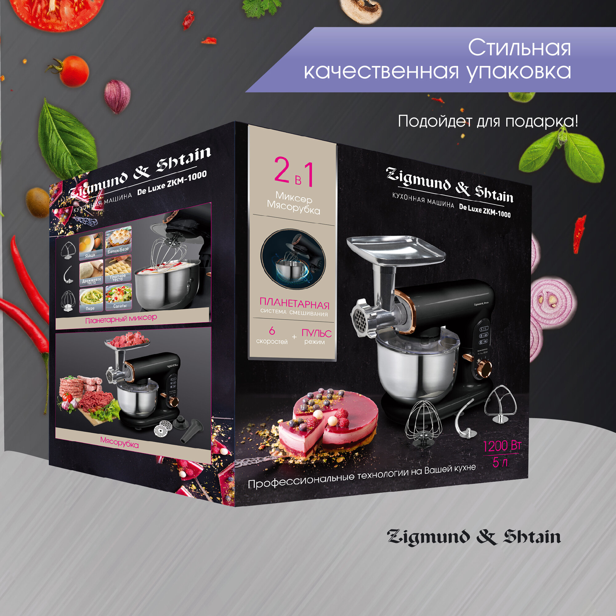 Комбайн Zigmund & Shtain превращает приготовление пищи в удовольствие, благодаря разнообразию функций. На смену мясорубки, миксера пришел новый прибор, совмещающий процесс измельчения, взбивания, смешивания ингредиентов.При выборе кухонной техники покупатели ориентируются на показатели качества. Надежность, производительность, многофункциональность определяют удобство хозяйки. Кухонная машинка должна быстро разбираться, иметь дополнительную емкость для насадок, множество приспособлений, облегчающих работу. Zigmund & Shtain отвечает требованиям покупателей по параметрам:многофункциональность;планетарное вращение мешалки повышает качество вымешивания, взбивания сырья;режим турбо увеличивает скорость вращения до максимальных величин;6 скоростей под любые задачи и быстрый результат;мясорубка имеет насадки для колбасных изделий, зраз и фарша, чтобы вы могли наслаждаться мясными блюдами из натуральных продуктов.