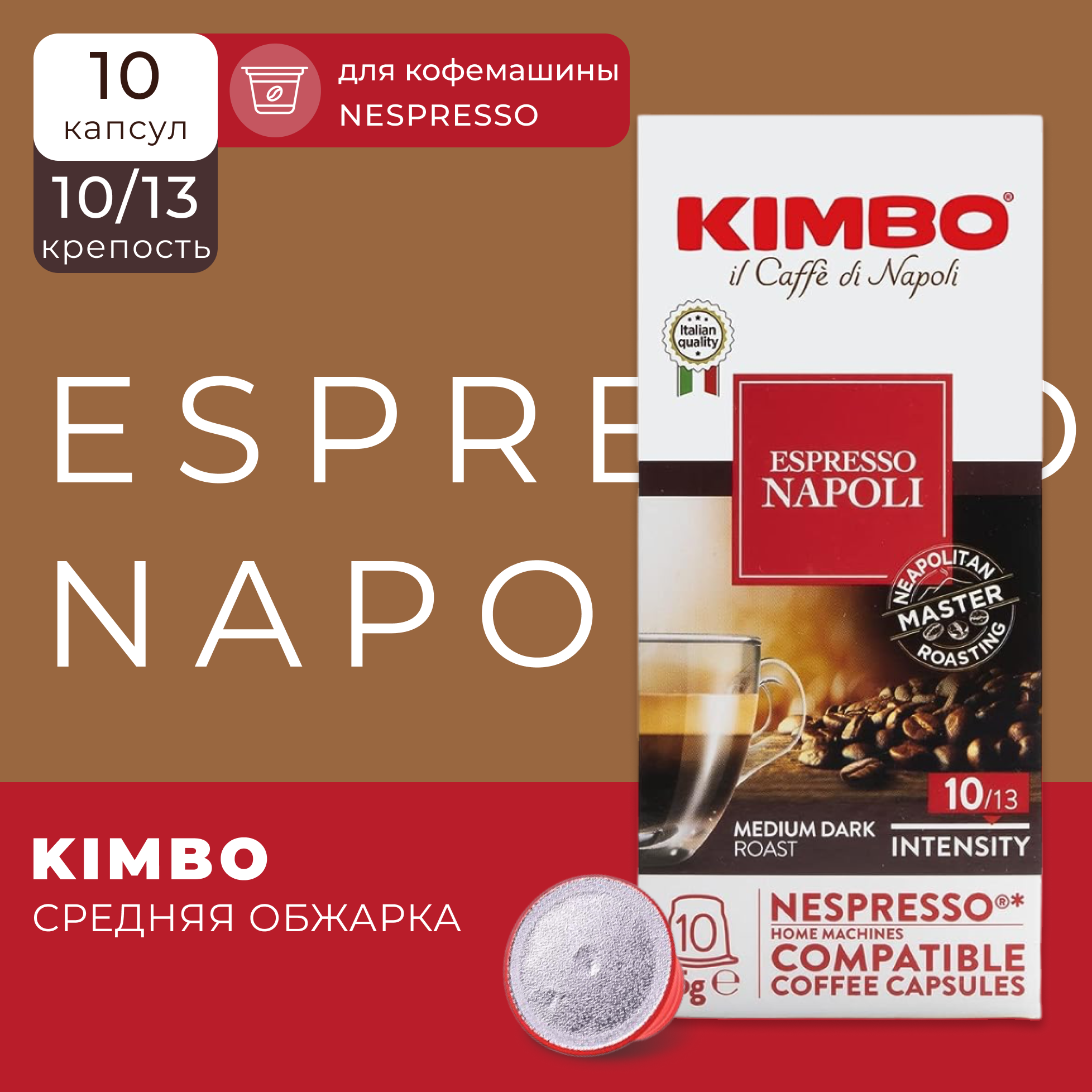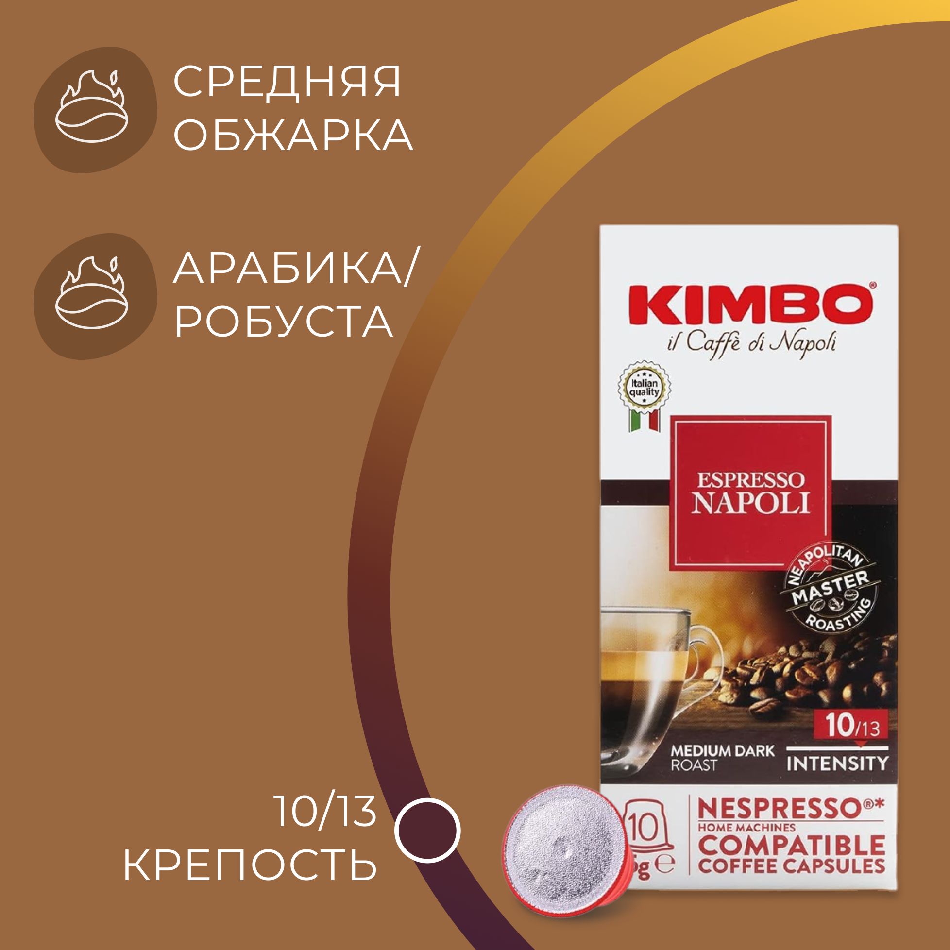 Кофе Kimbo Napoli в капсулах — смесь из отборных арабики и робусты, которые обжаривались до темного уровня по итальянской технологии. Кофейные бобы подверглись тонкому помолу, после чего были расфасованы в мини-контейнеры из пищевого пластика. Одна порция содержит 5,7 г натурального молотого продукта, из которого с помощью кофемашины формата Nespresso можно получить насыщенный эспрессо со сладковатыми нотками бисквита во вкусе и тонким пряно-цветочным запахом. Кофе Кимбо в капсулах упаковывается по 10 штук в стильные картонные боксы.Состав: 80% арабика, 20% робуста