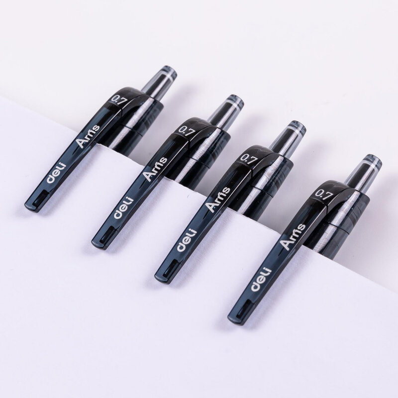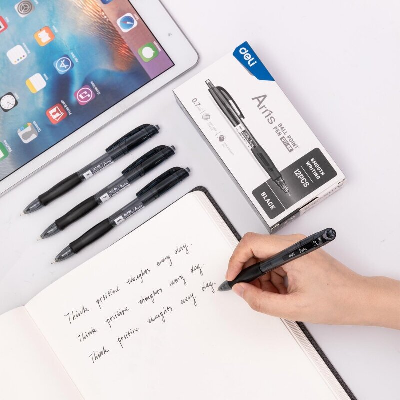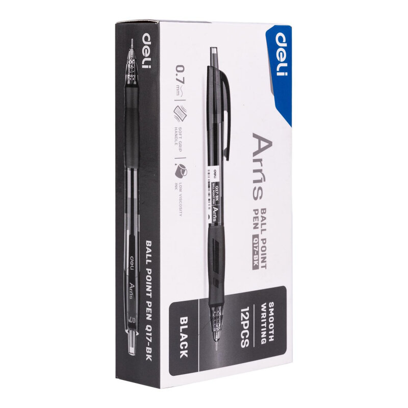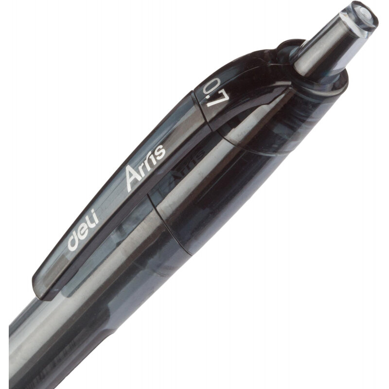 Ручка черная шариковая автоматическая Deli Arris с диаметром пишущего узла 0.7 мм. Мягкая каучуковая подушечка предотвратит скольжение пальцев при письме. Цвет грип-зоны и клипа соответствует цвету чернил. Удобный клип позволяет фиксировать ручку на ежедневниках, блокнотах и карманах одежды. В производстве ручек используются чернила пониженной вязкости, обеспечивающие необыкновенно мягкое и четкое письмо на любой бумаге. Высококачественные чернила позволяют увеличить продолжительность письма и сократить их расход. Ручка с игольчатым наконечником пишет очень тонко и аккуратно. Длина непрерывной линии составляет 1000 м при толщине 0.35 мм, что является высоким показателем в своей категории.