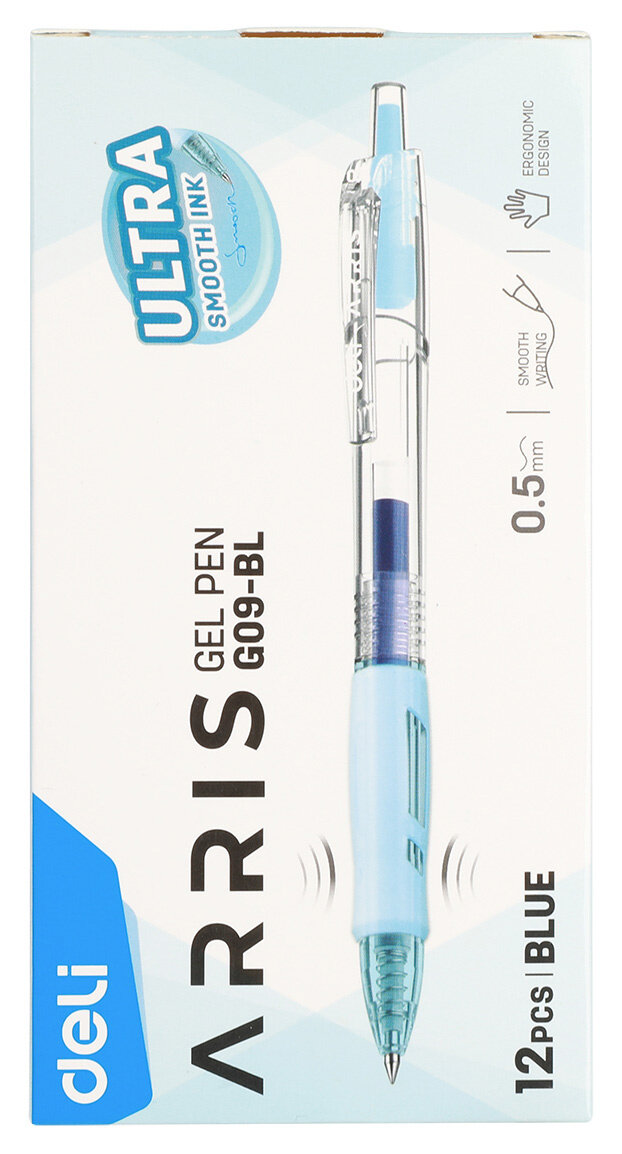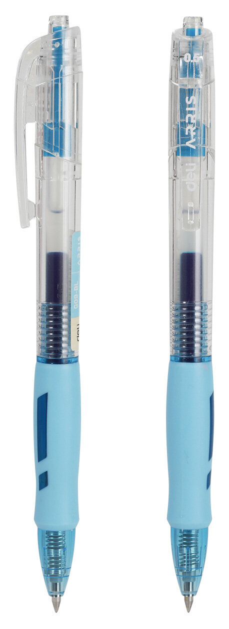 Ручка гелевая автоматическая Deli Аrrow с удобной для письма мягкой зоной захвата обеспечивает легкое, мягкое и комфортное письмо.Ручка автоматическая удобно лежит в руке и не вызывает дискомфорта даже при длительном использовании. Четкие линии чернил не размазываются при нечаянном соприкосновении с рукой. Ручка гелевая не оставляет следов с обратной стороны бумаги, не пачкает и не царапает ее. В производстве ручек используются чернила пониженной вязкости, гарантирующие необыкновенно мягкое и четкое письмо на любой бумаге. Ручка гелевая Deli Arris имеет прозрачный пластиковый корпус, что позволяет контролировать уровень расхода чернил. Удобный клип позволяет фиксировать ручку на ежедневниках, блокнотах и карманах одежды.Цвет чернил: синий.Толщина линии письма: 0.35 мм.Диаметр шарика: 0.5 мм.Форма наконечника: пулевидная.