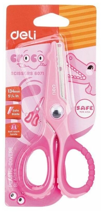 Лезвия ножниц покрыты пластиком для безопасного использования. Ручка имеет мягкое покрытие.