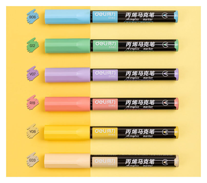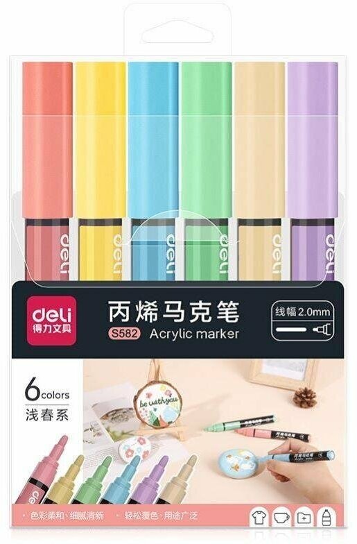 Набор цветных акриловых маркеров Deli для любых поверхностей. Легко смешивать цвета и создавать мягкие полутона и переходы. Маркеры хорошо рисуют на стеклянных, каменных, керамических, бетонных, резиновых, пластиковых поверхностях. Подходят для граффити, живописи, декорирования и рисования на ткани. Могут писать по горячей (до 130 градусов) поверхности. Пишут по загрязненным поверхностям. Чернила гарантируют, что надписи не выцветут при попадании солнечных лучей и не растекутся при попадании влаги. Маркеры пишут ярко и сочно. Пулевидный войлочный наконечник маркера позволяет оставлять за собой след 2 мм, а удобный и надежный колпачок облегчит хранение текстовыделителей. Плюс подобной формы заключается в том, что чернила поступают дозированно. Маркеры не токсичные, без запаха и безопасны для детей. Художественный акриловый маркер — это отличный презент для новичков и опытных художников, детей, которые обучаются в художественной школе, а также всем кто просто любит рисовать. Упакованы в пластиковую коробку с европодвесом. Набор 6 штук.