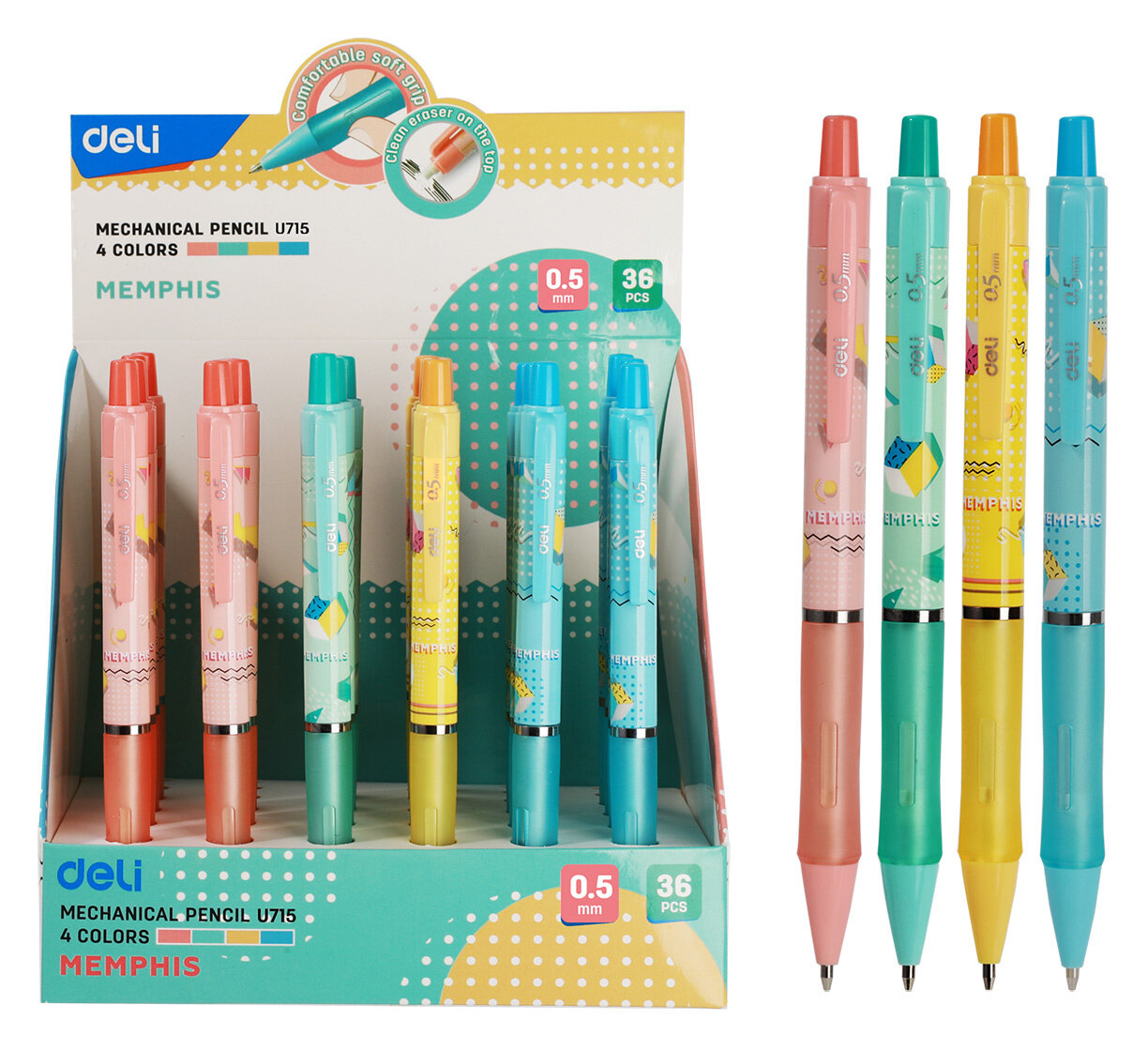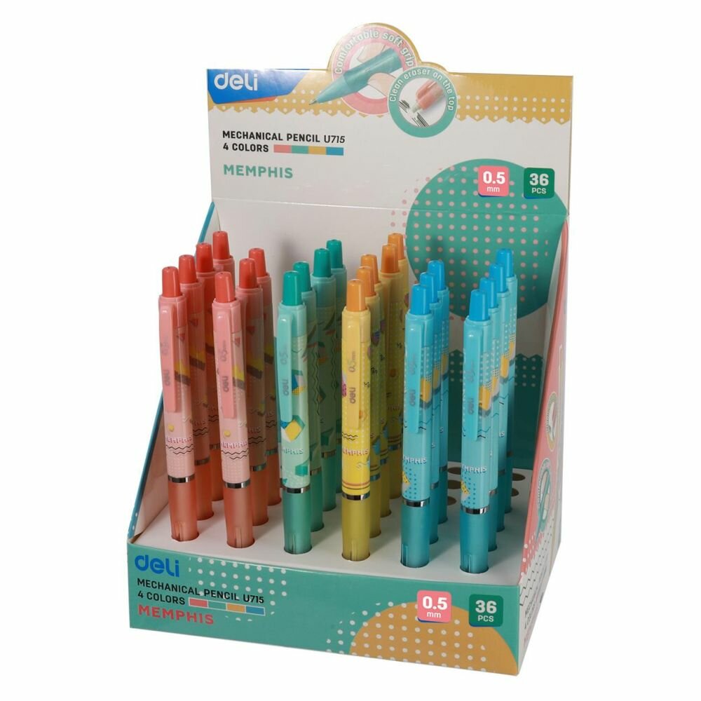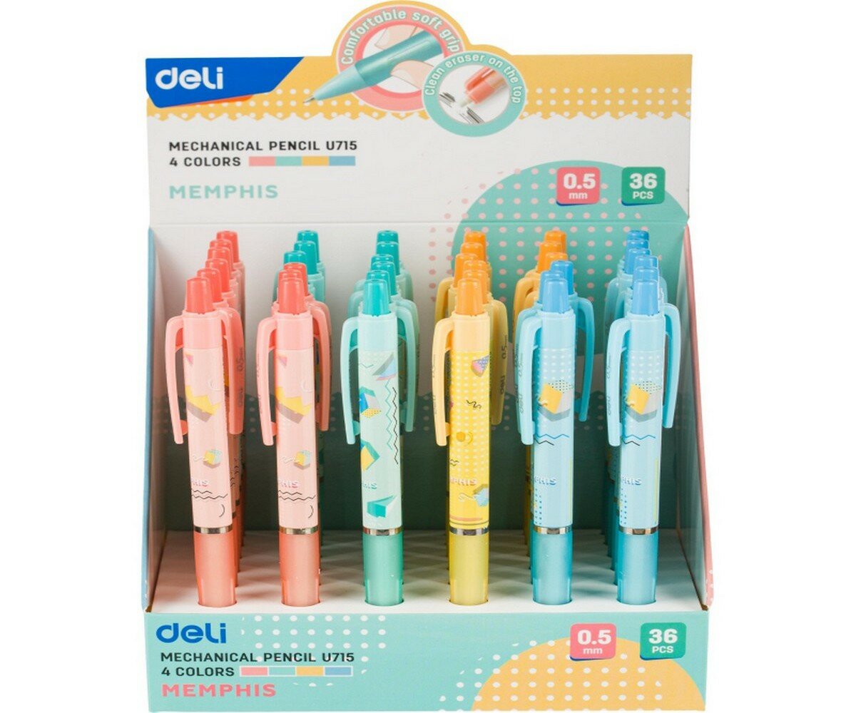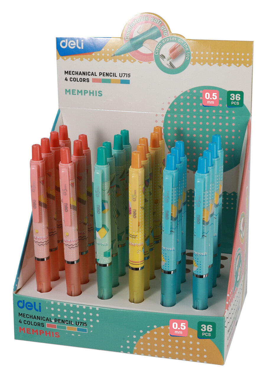 Карандаш механический Deli с толщиной линии письма 0,5 мм. Выполнен в пластиковом корпусе, имеет мягкую прорезиненную область захвата. Обладает металлическим наконечником и ластиком. Нажимной механизм обеспечивает плавную подачу грифеля. Внимание! Товар поставляется в нескольких вариантах цвета/дизайна (без возможности выбора).