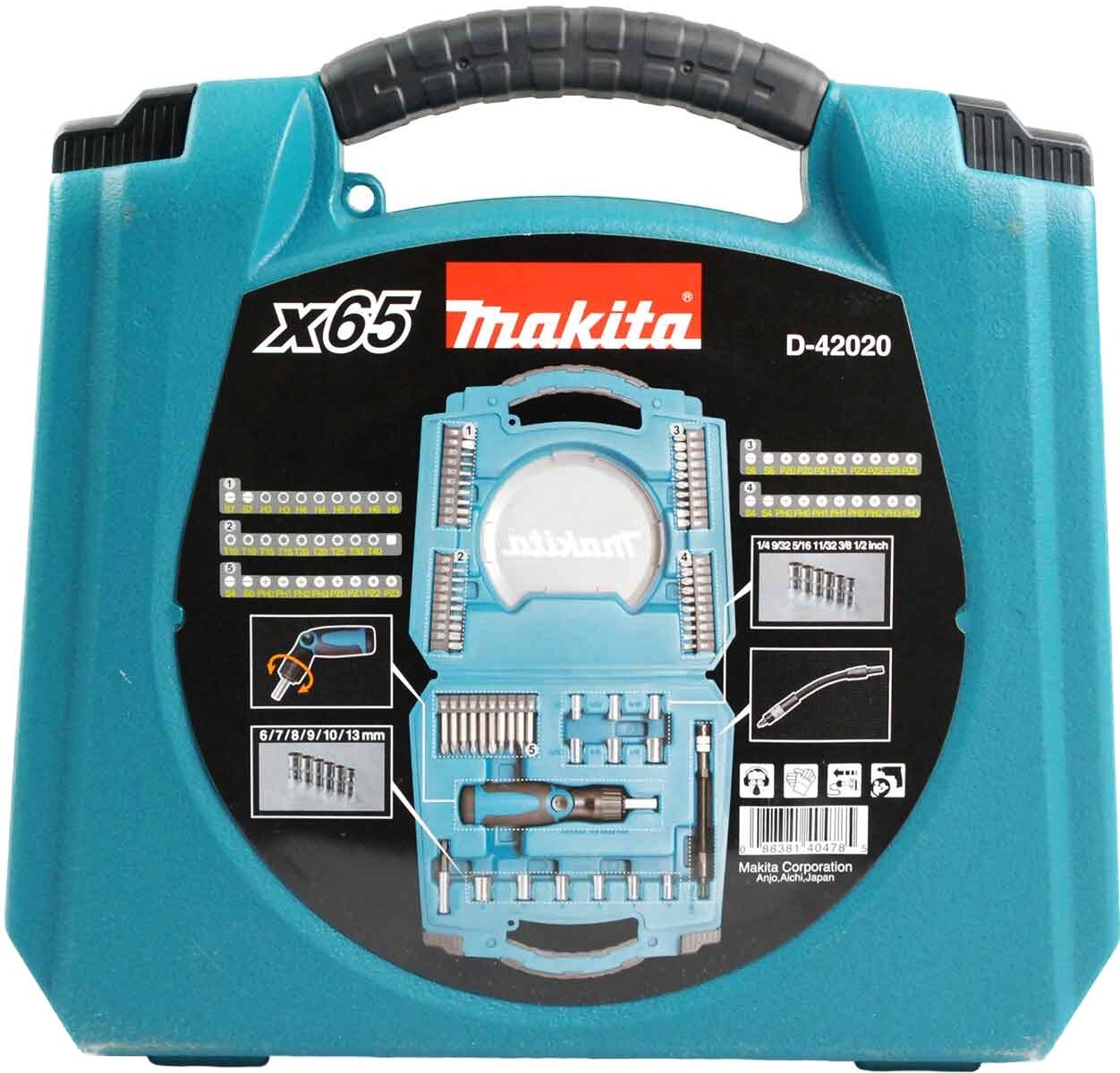 | Состав набора | Набор инструмента Makita "Circle series" 65 предметов - универсальный комплексный набор насадок с реверсивной отверткой. Может использоваться для различных работ. Поставляется в практичном пластиковом кейсе. |