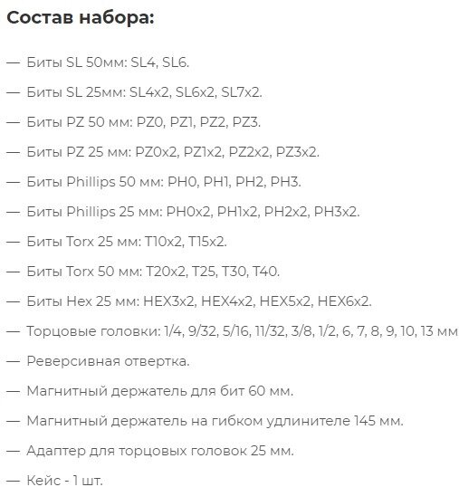 | В комплекте | набор бит HX (шестигранник); набор бит Ph (крест); набор бит Pz (крест); набор бит SL (шлиц); набор бит Torx; набор головок |