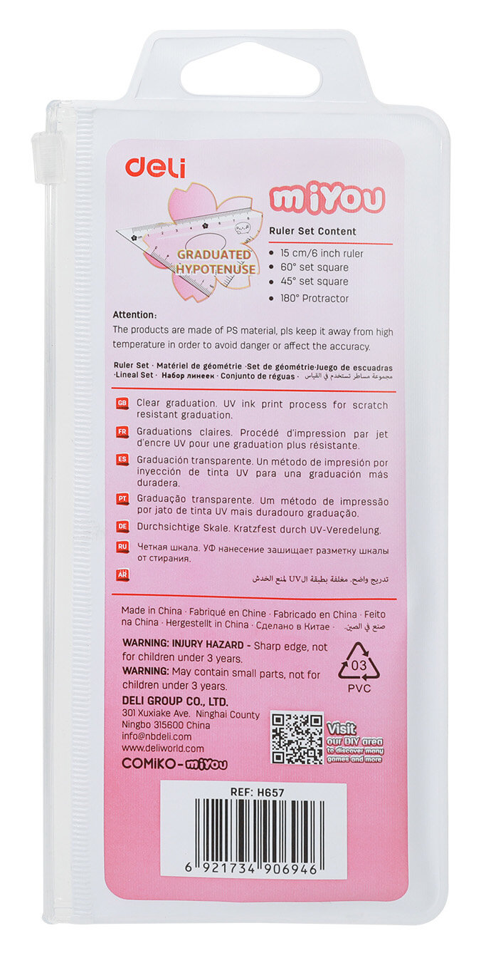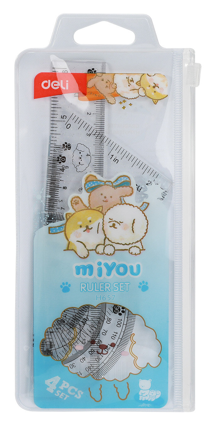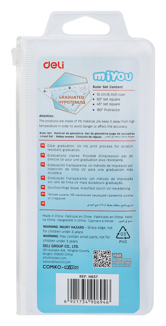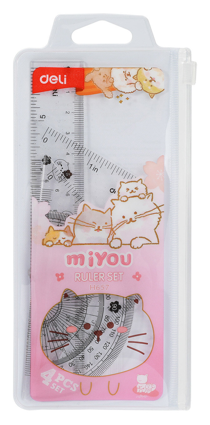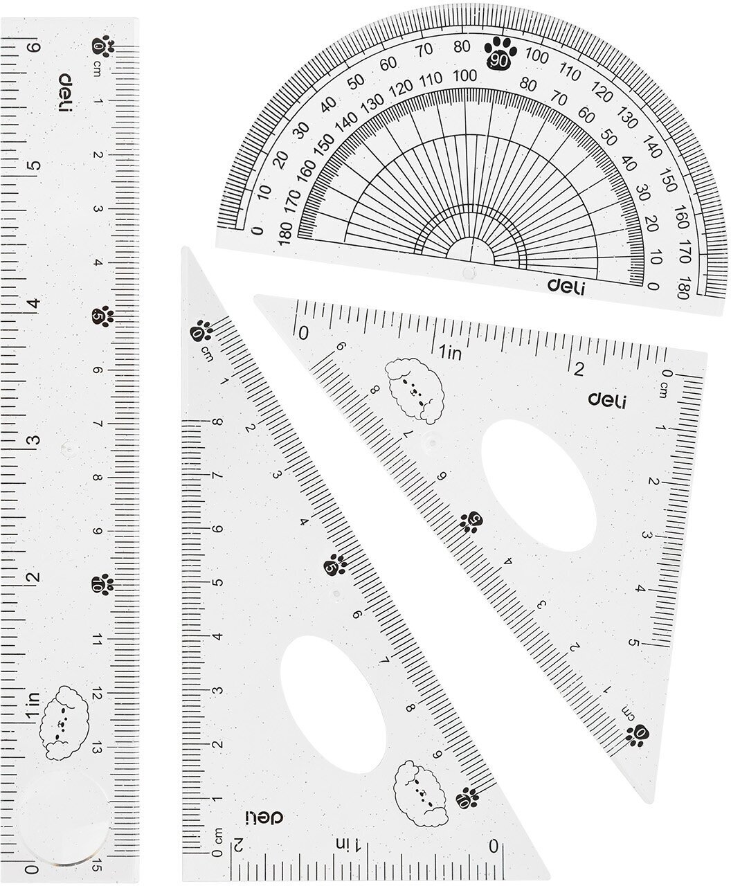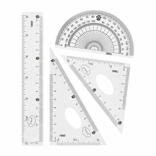 Провести прямую линию и начертить отрезок на уроке математики? Легко! Набор линеек Deli MiYou изготовлен из высококачественного, плотного и прочного полистирола. Состоит из 4х предметов: линейка с длиной разметки 15 см, 2 треугольника и транспортира. Нанесенная четкая разметка под воздействием ультрафтолетовых лучей - позволяет не только производить точные измерения, но и делает ее устойчивой к царапинам. Для удобства на линейку нанесена разметка как в сантиметрах, так и в дюймах.