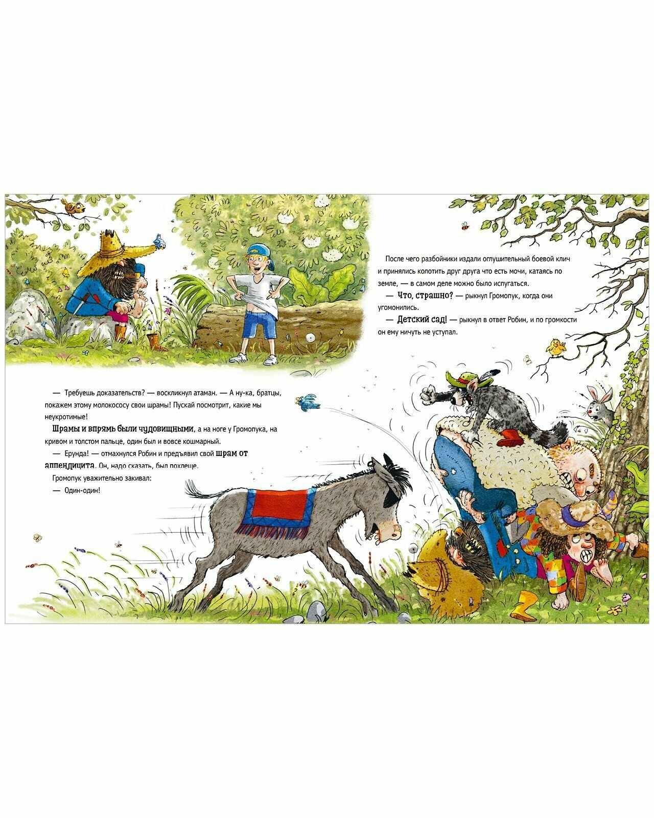 ТР-Р-Р-Р-Р!.. — разносится по всему Грохочущему лесу. Поговаривают, что в нем живут ужасные разбойники! Оттого-то в него почти никогда никто и не ходит, а еще реже оттуда выходит. Вот только Робин ничего не боится. Правда, в лесу он тут же попал прямо в лапы разбойников. Но Робин — хитрый малый, и в этом разбойникам до него далеко! Он смело бросает шайке вызов. Однако коварного атамана по имени Громопук не так легко провести…