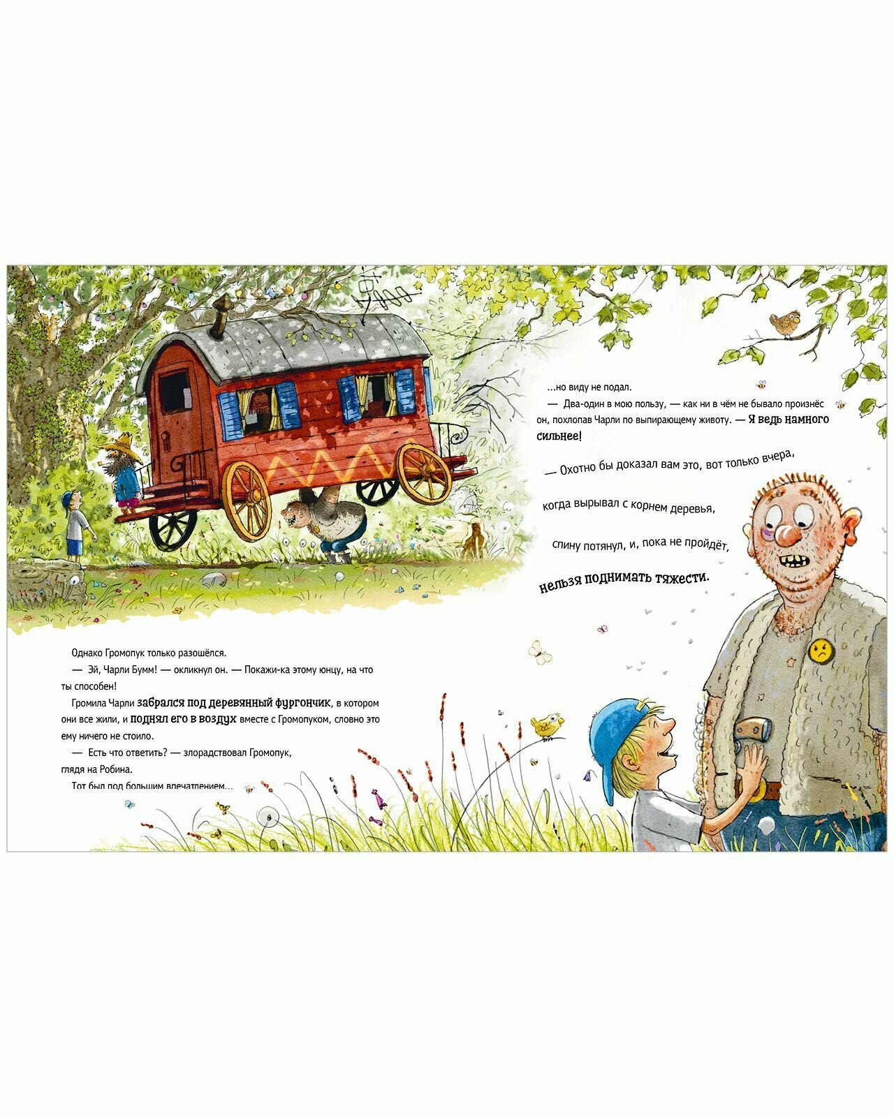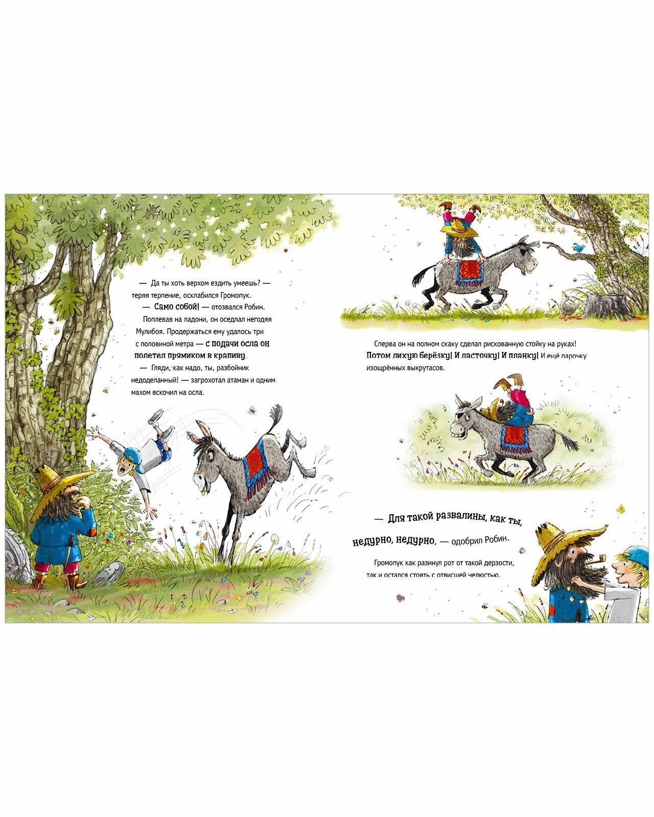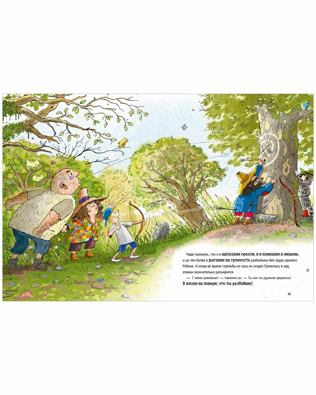 Книга «Ужасный разбойник Громопук» идеально подойдет для первых шагов ребенка в самостоятельном чтении. Тут большие сюжетные иллюстрации на каждой странице, крупный шрифт, весь текст разбит на небольшие абзацы. А история про Робина и банду Громопука точно не даст заскучать.